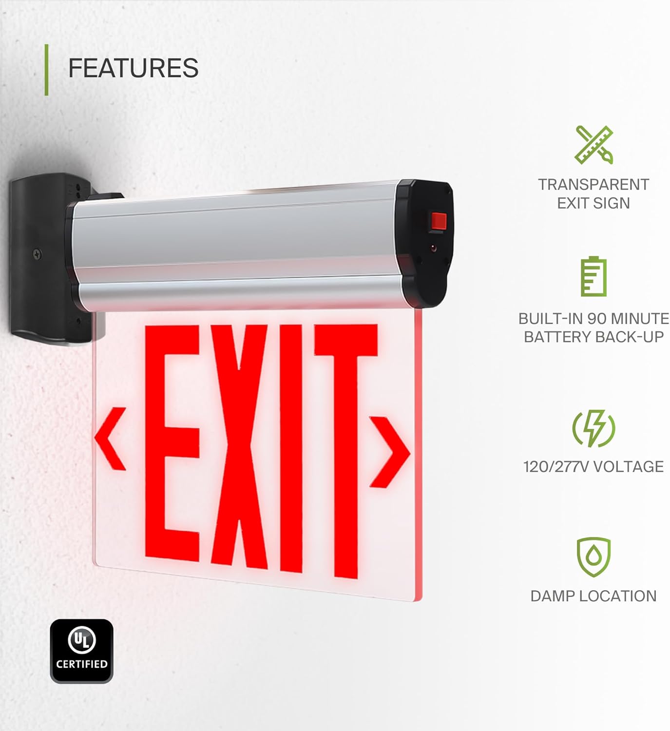 DESIGN. ASD EDGE-LIT LED TRANSPARENT EXIT SIGN features durable, flame-retardant, and corrosion-resistant construction, modern brushed aluminum housing and clear acrylic panels. Each model provides bold red “EXIT” lettering, visible from up to 100 feet, ensuring compliance with U.S. standards. The sign includes field-installable directional arrows for flexible installation