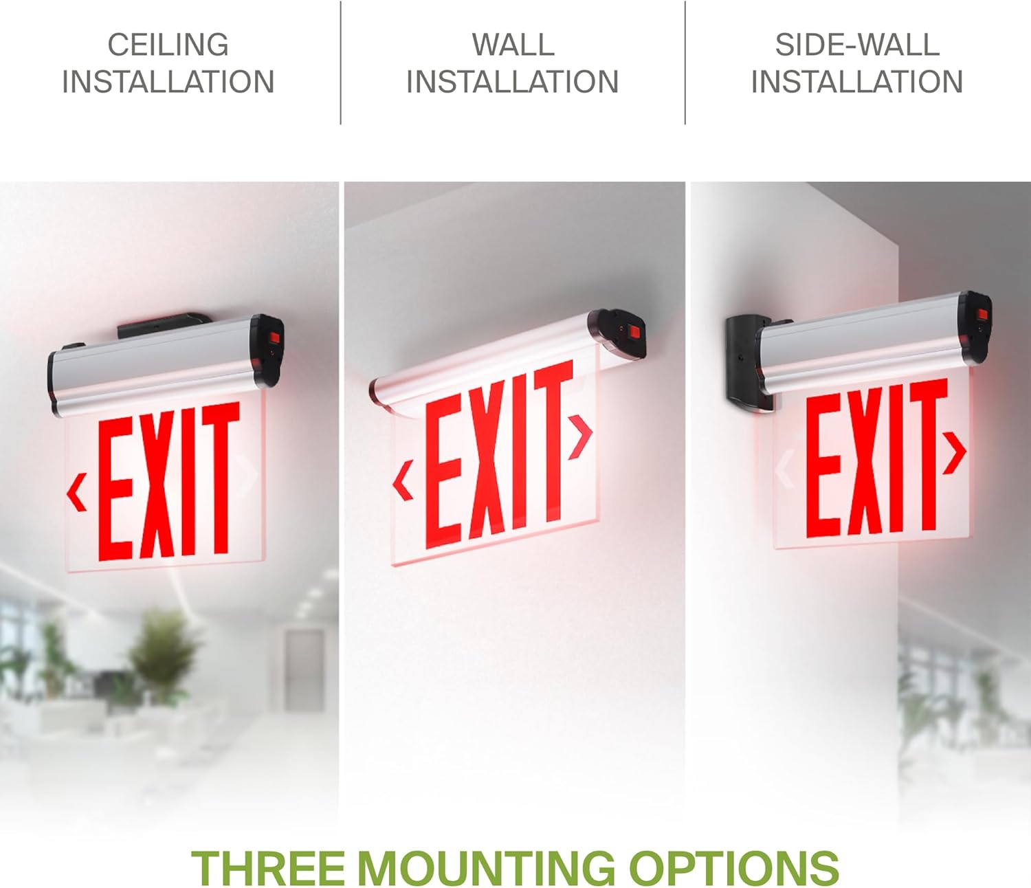 INSTALLATION. This exit sign with emergency lights offers three mounting options: ceiling mount, wall mount and side-wall mount, with mounting hardware and a canopy included. Test buttons and indicator LEDs are also included to verify functionality during setup and maintenance