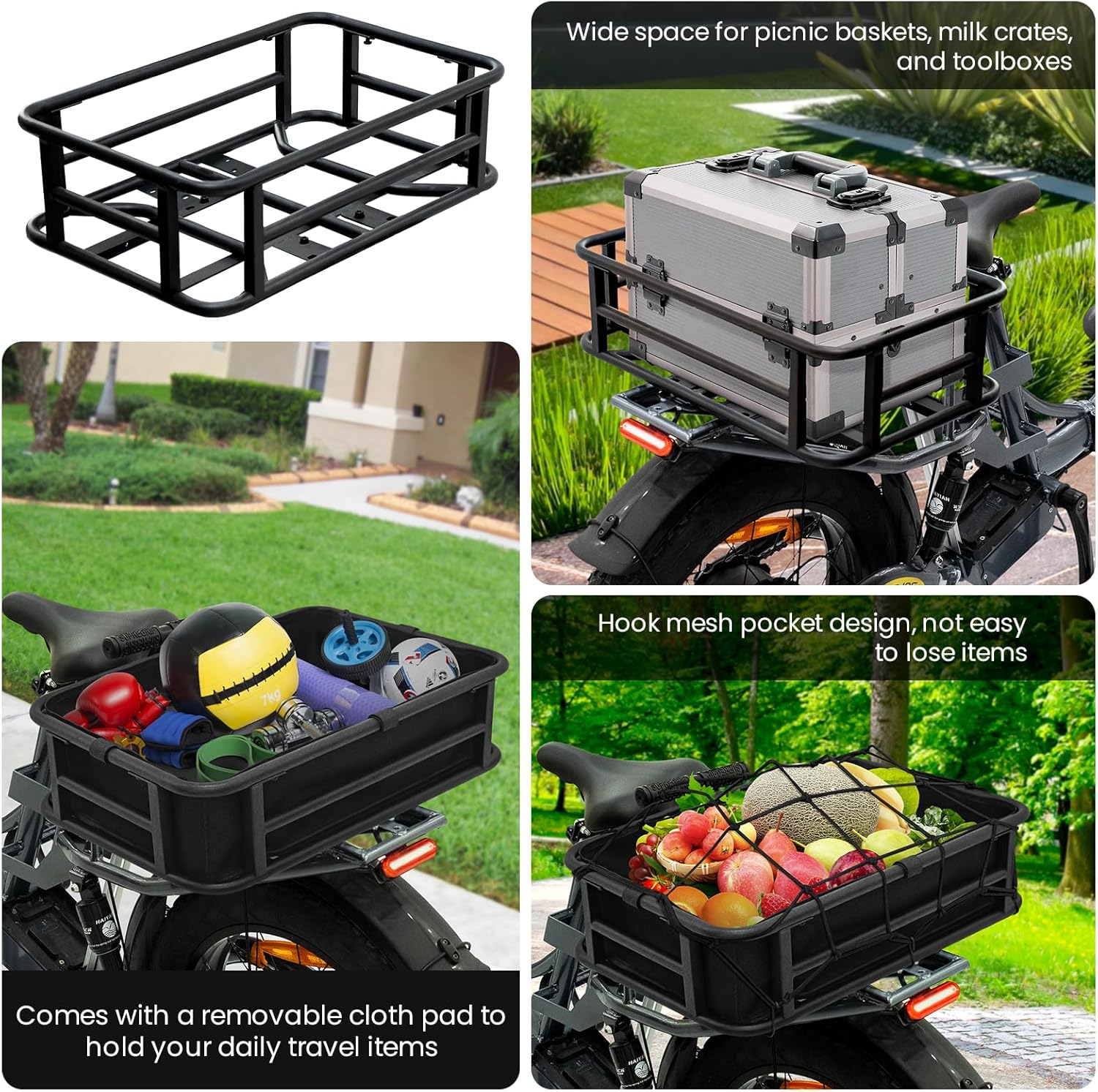 🚲【Super Metal】Electric bike rear basket is made of super strong iron metal and can hold up to 88 pounds. The exterior is coated with a sturdy anti-rust coating, waterproof and rainproof, not easy to deform, stable load bearing, and can be used for a long time.