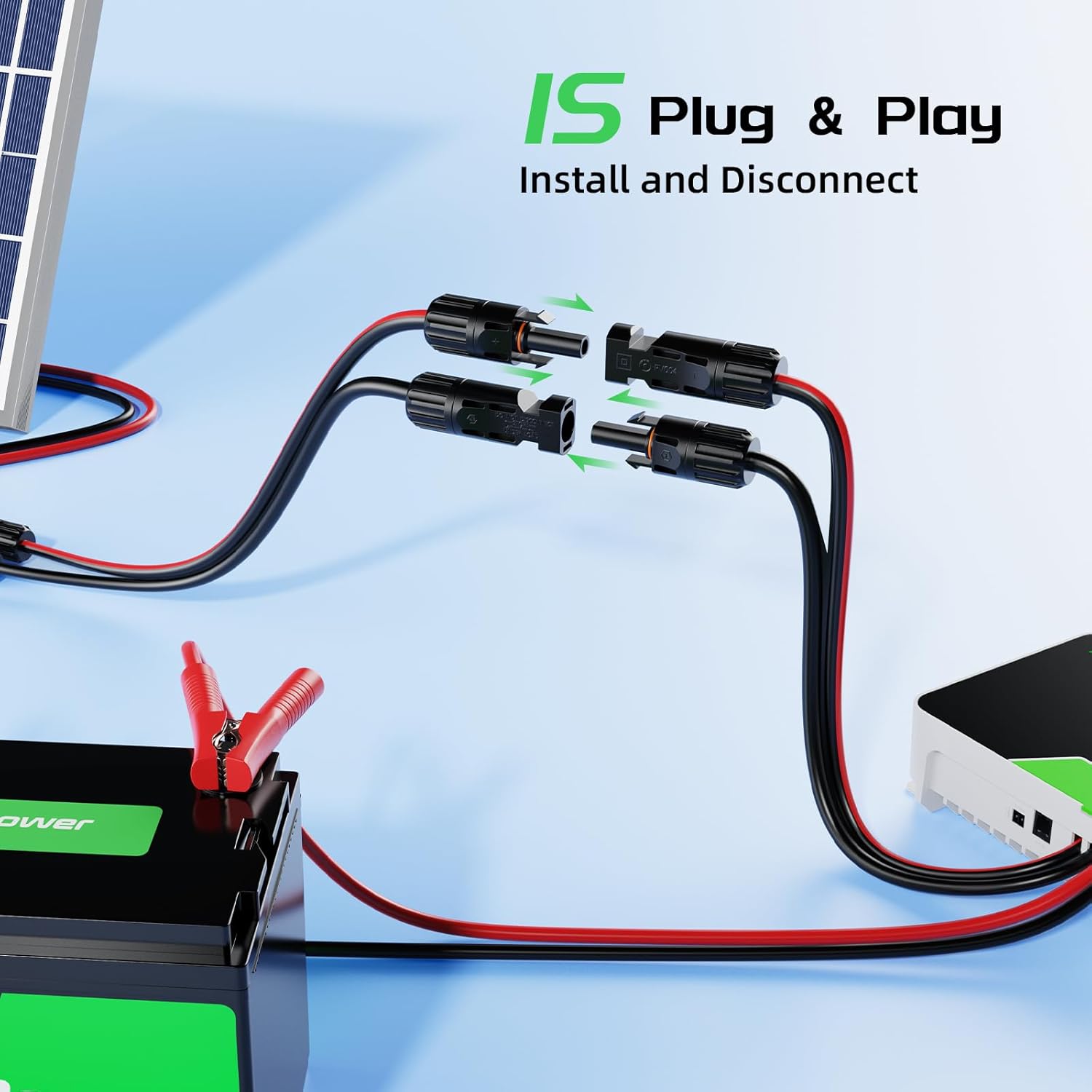 【Professional and Safe Solar Cable】The solar panel wires have passed EN 50618:2014 H1Z2Z2-K IEC 62930 62930 IEC 131 certification. The solar panel cables and connectors are free to build an off-grid system, the cable length is 6ft/10ft/20ft/30ft/40ft/50ft, which is enough for use.
