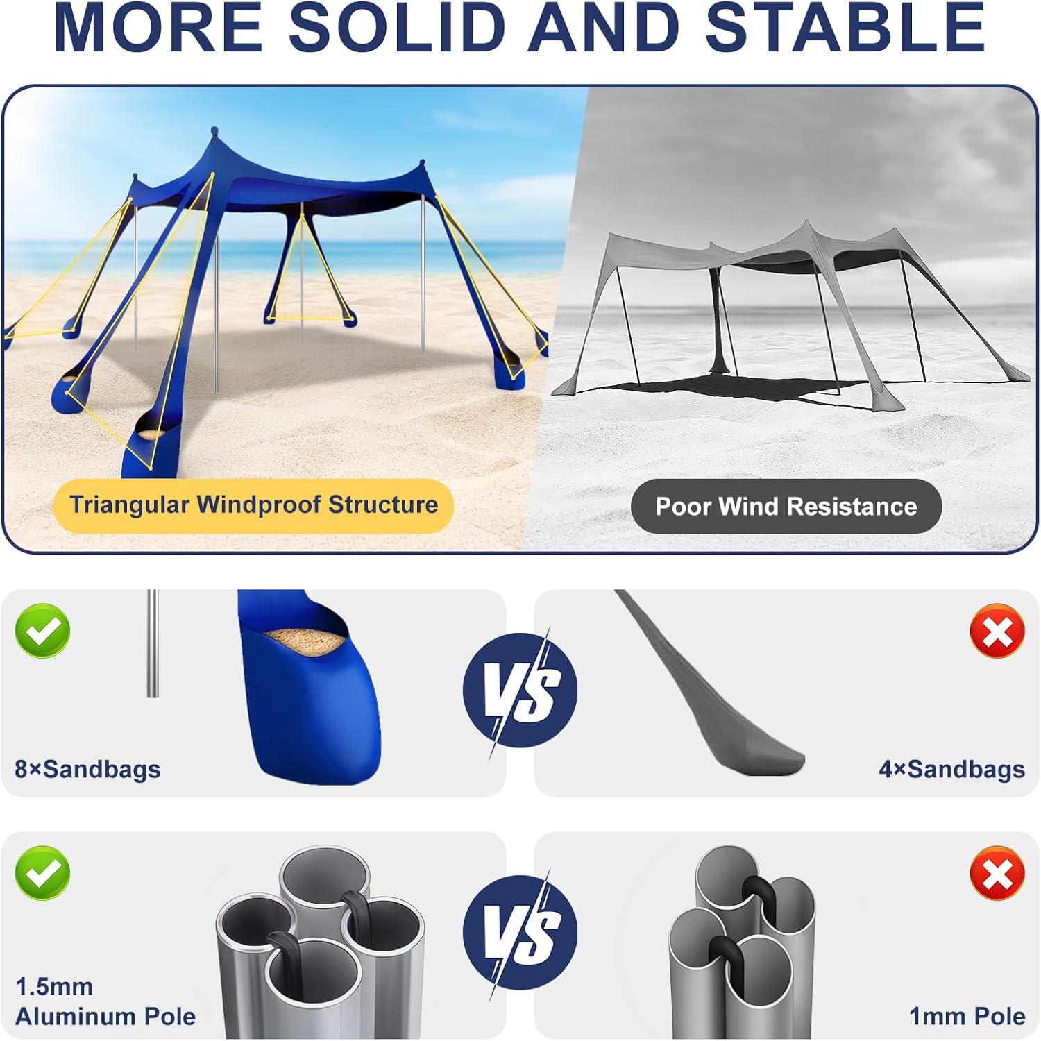Excellent Wind Resistance: Our beach tent sun shelter features a triangular windproof structure and is equipped with 8 sandbags, 4 aluminum poles, 8 sand stakes, and 8 grass stakes. It is sturdy enough to withstand strong beach winds, ensuring stability and preventing collapse. Tested to withstand winds up to 25 mph