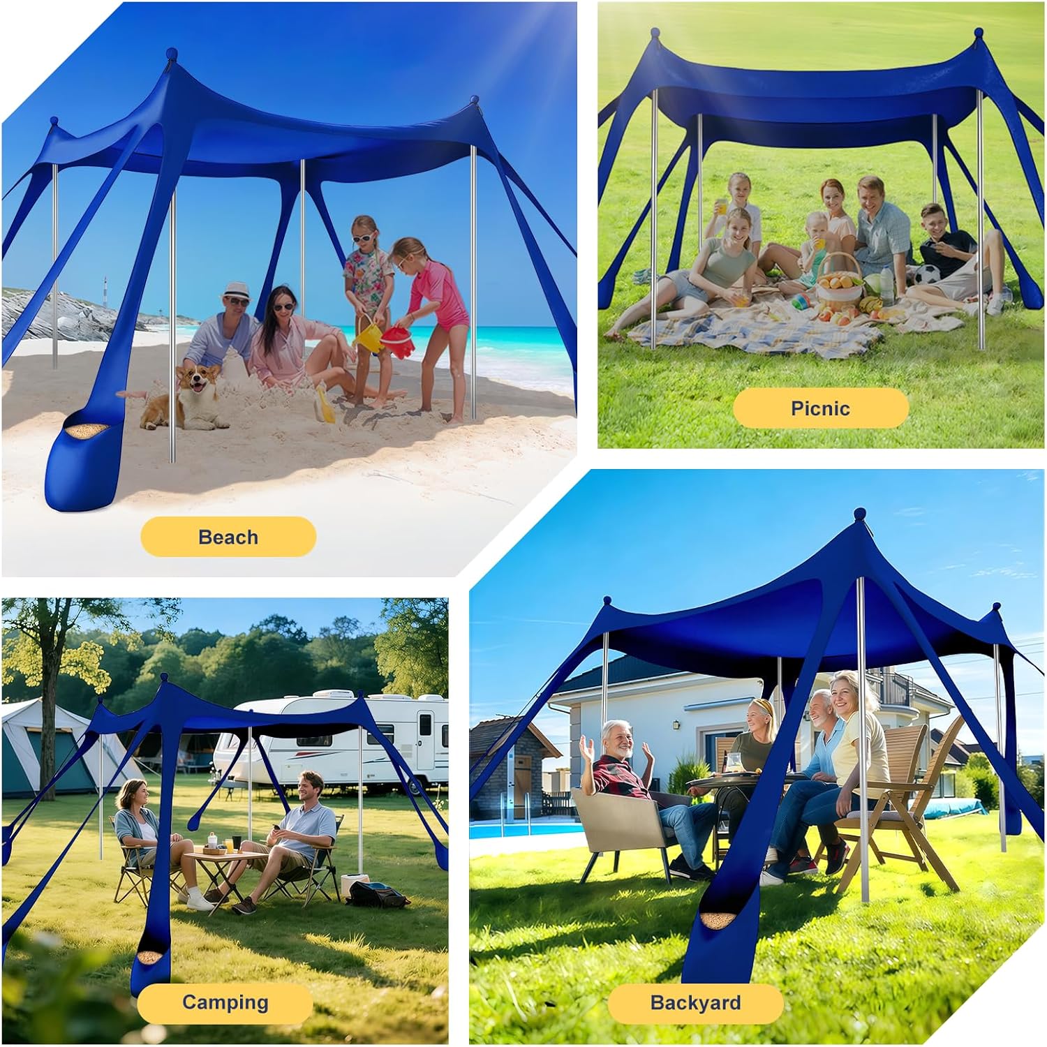 UPF 50+ Sun Protection: Our beach canopy tent sun shade is crafted from Lycra fabric with 12% spandex, with excellent tensile strength for long-lasting durability. It can block 98% of harmful rays and reduce heat accumulation. The waterproof coating can resist sudden rain. Four-sided ventilation design, allowing for natural cooling without feeling stuffy