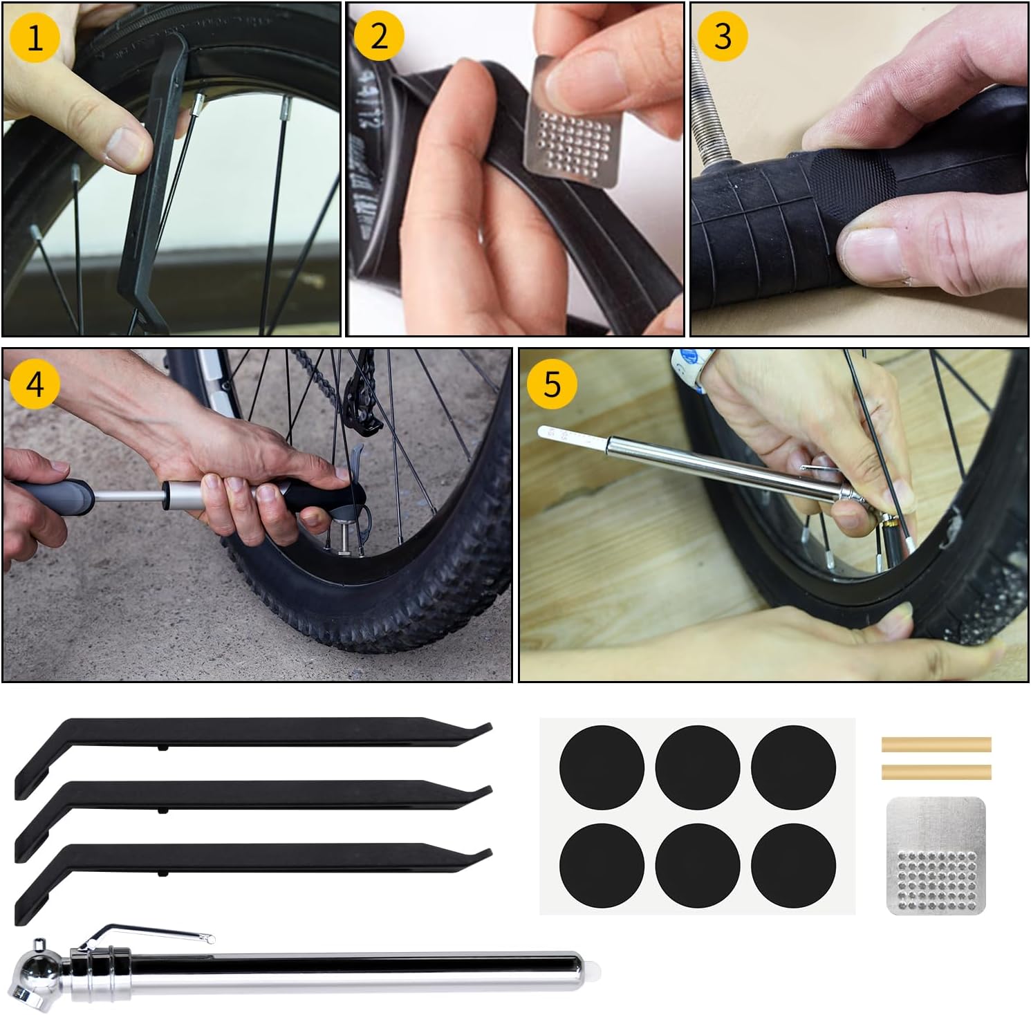【Package Content】- Bike repair kit includes 1pcs bike tube bag, 1pcs mini bike pump with schrader valve and presta valve, 1pcs 16 in 1 multi-function bike tool and a bike repair box which includes 2pcs tire levers, 1pcs polish metal, 6pcs glueless patches and 1pcs plastic box.