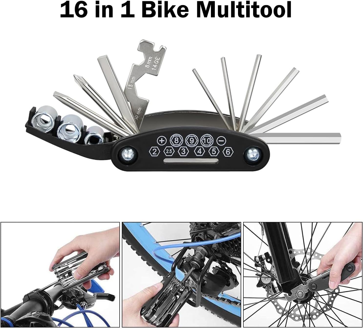 16 in 1 Multifunction Repair Tool—Foldable multi function bicycle tool is made of high quality stainless steel, sturdy and durable. Bike repair kits includes Socket Wrench (mm): 8/9/10 and a extension rod, hex key(mm): 2/2.5/3/4/5/6, Flat Wrench (mm): 8/10/15, slot driver, spoke 14GE, and phillips cross drive