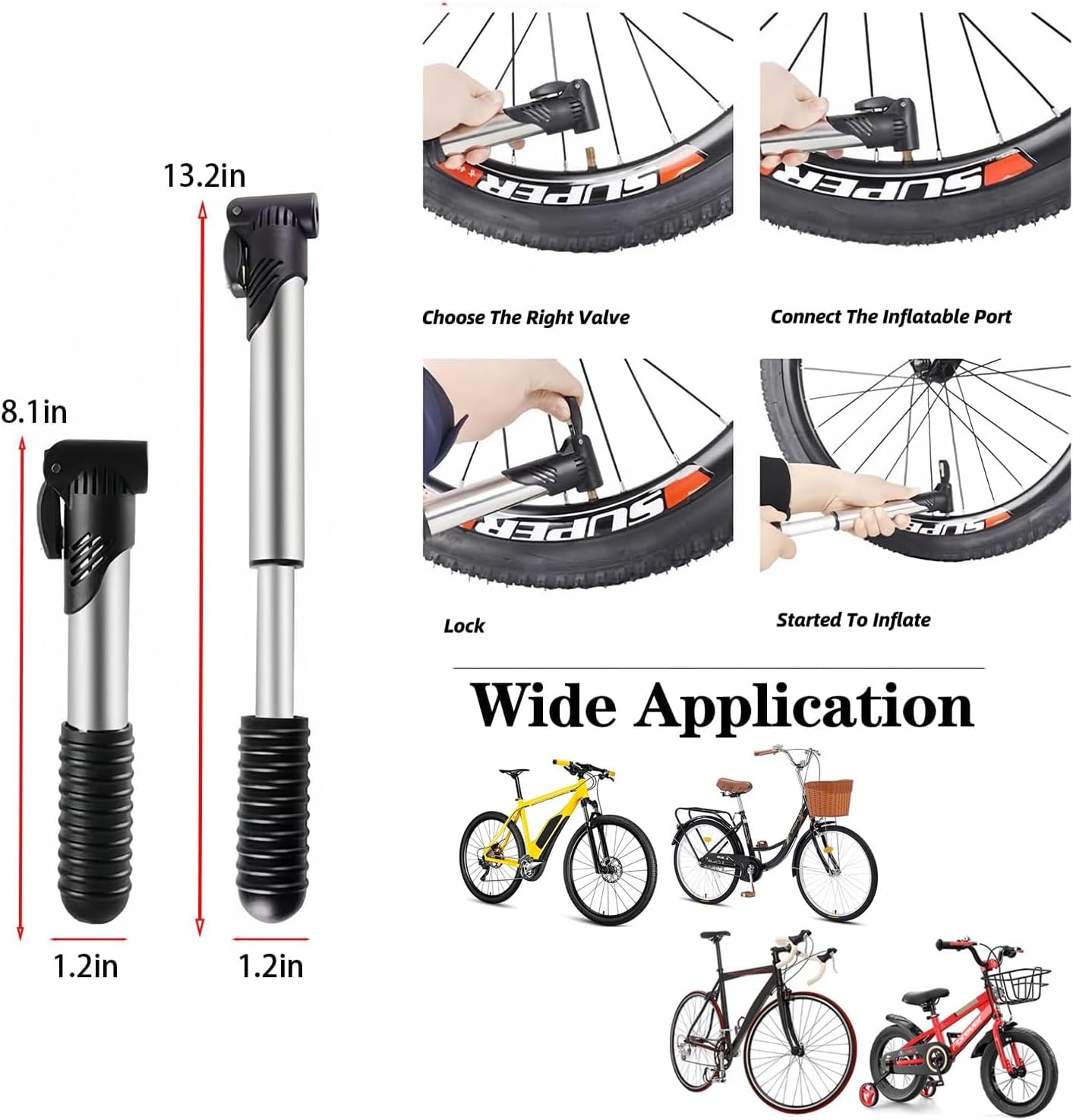 Mini Bike Pump— The air pump is sturdy and durable by made of stainless steel and plastic. With a compact design, it is only 20.5cm long, is easy to carry, and can fit in most bicycle bags. you can easily pump up different bikes on the road