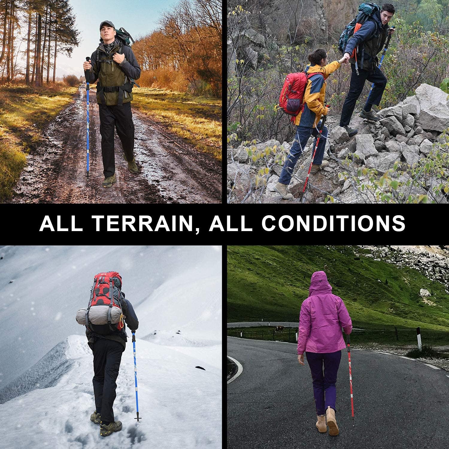 【COMPACT DESIGN, MORE CONVENIENT TO CARRY】This trekking poles’ retractable tri-fold design let them collapse down to a portable 13.8 inches (35 cm) easily and quickly. Fitting into a backpack, luggage cases, or duffel bags for compact travel! When in use, you can extend your poles from 45.3″ all the way to 53.2″ quickly. These canes are available in red and blue colors and are an excellent gift for fashion-conscious people.