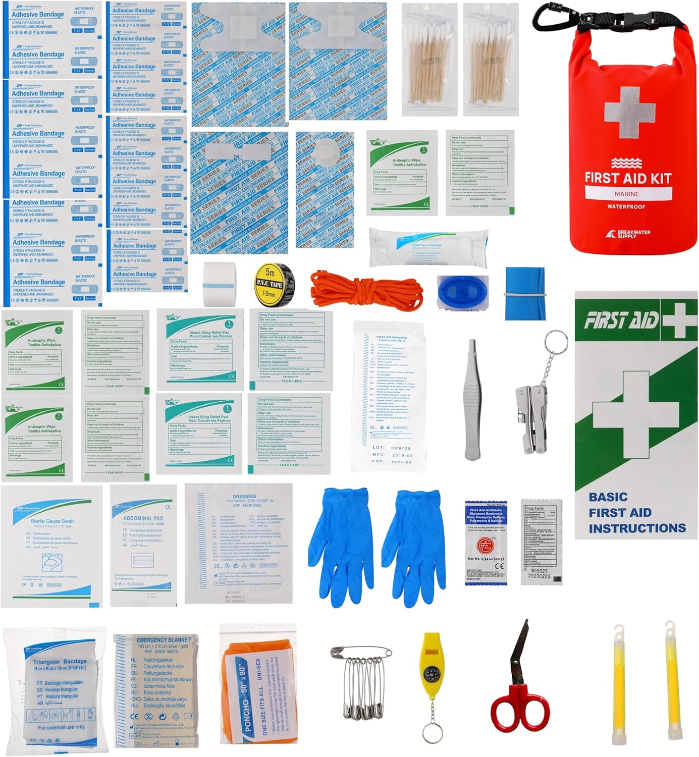 Packing List Bandages, Adhesive – 76mm x 25mm (5), Bandages, Adhesive Standard Size – 76mm x 19mm (10), Bandages, Adhesive Knuckle – 76mm x 38mm (5), Bandages, Adhesive Spot – 20mm x 20mm (5), Bandage, Compression Roll – 8cm x 10cm (1), Bandage, PBT Roll – 6cm x 4m (1), Bandage, Triangular – 6cm x 96cm x 136cm (1), Burn Dressing – 40cm x 60cm (1), Butterfly Closure, Adhesive – 10mm x 45mm (5), Cotton Swabs (20), CPR Mask (1), Emergency Blanket – 160cm x 210cm (1) Packing List (Continued) First Aid Tape – 1.25cm x 5m (1), Gauze Pad, ABD – 5″ x 9″ (1), Gauze Pad, Large – 7.5cm x 7.5cm (2), Light Sticks (2), Multitool Knife with LED Light (1), Nitrile Gloves (2), Ointment – 0.9g (3), Paracord – 13′ / 4m (1), PVC Tape – 18mm x 5m (1), Rain Poncho – 50″ x 80″ (1), Safety Pins – 3.8cm (10), Scissors, Metal – 10cm (1), Sting Relief Pads – 3cm x 6cm (4), TPE Tourniquet – 2.5cm x 4.5m (1), Tweezers, Metal (1), 4-in-1 Compass + Whistle + Magnifier + Thermometer (1) Packing List (Continued) Wipes, Antiseptic – 15cm x 12cm (6), Waterproof Dry Bag 2L, First Aid Guide, Plastic Bag (3). NOTE: Full Packing List included in First Aid Kit. Item Count 100 FDA Registered Yes. This kit and all included items are FDA Registered.
