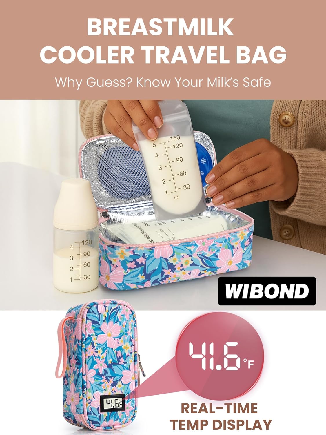 Breast Milk Cooler Travel Bag, Real-Time Temperature Display, Holds 20oz Breastmilk Storage Bag with 2 Breast Milk Ice Pack, Cooling & Waterproof Portable Cooler for Moms on The Go by WIBOND (Lily)