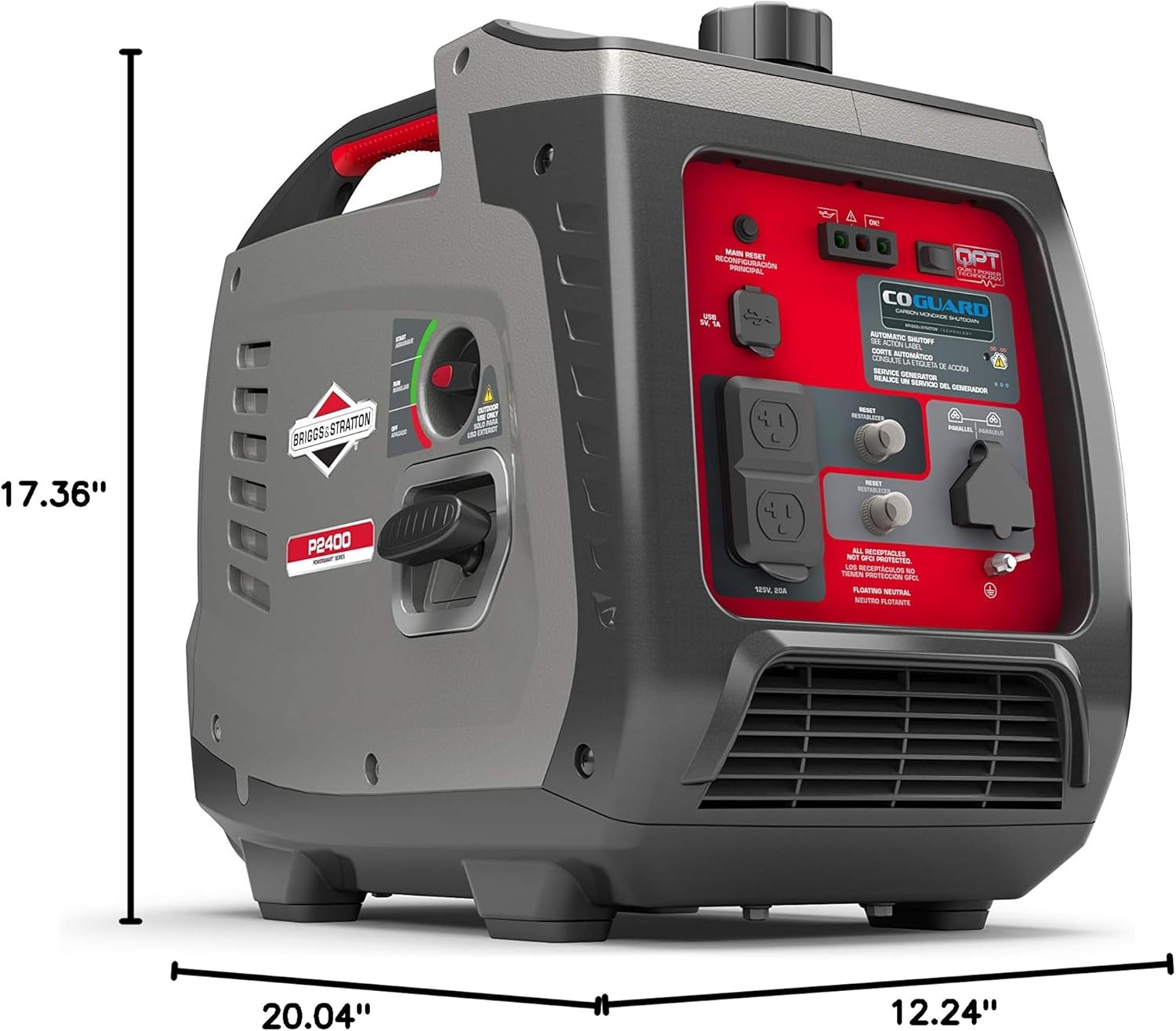 The Briggs & Stratton P2400 PowerSmart Series inverter generator provides the power you need for camping and recreation applications. A monitoring system features LED lights to alert low oil or overload. (2) 120V, 20A outlets, a parallel port, and USB ports allow you to stay connected and keep multiple items powered simultaneously. The lightweight, compact design offers easy transport and storage. For added protection, CO Guard carbon monoxide shutdown technology shuts down the generator if harmful levels of CO accumulate in the generator’s operating area.