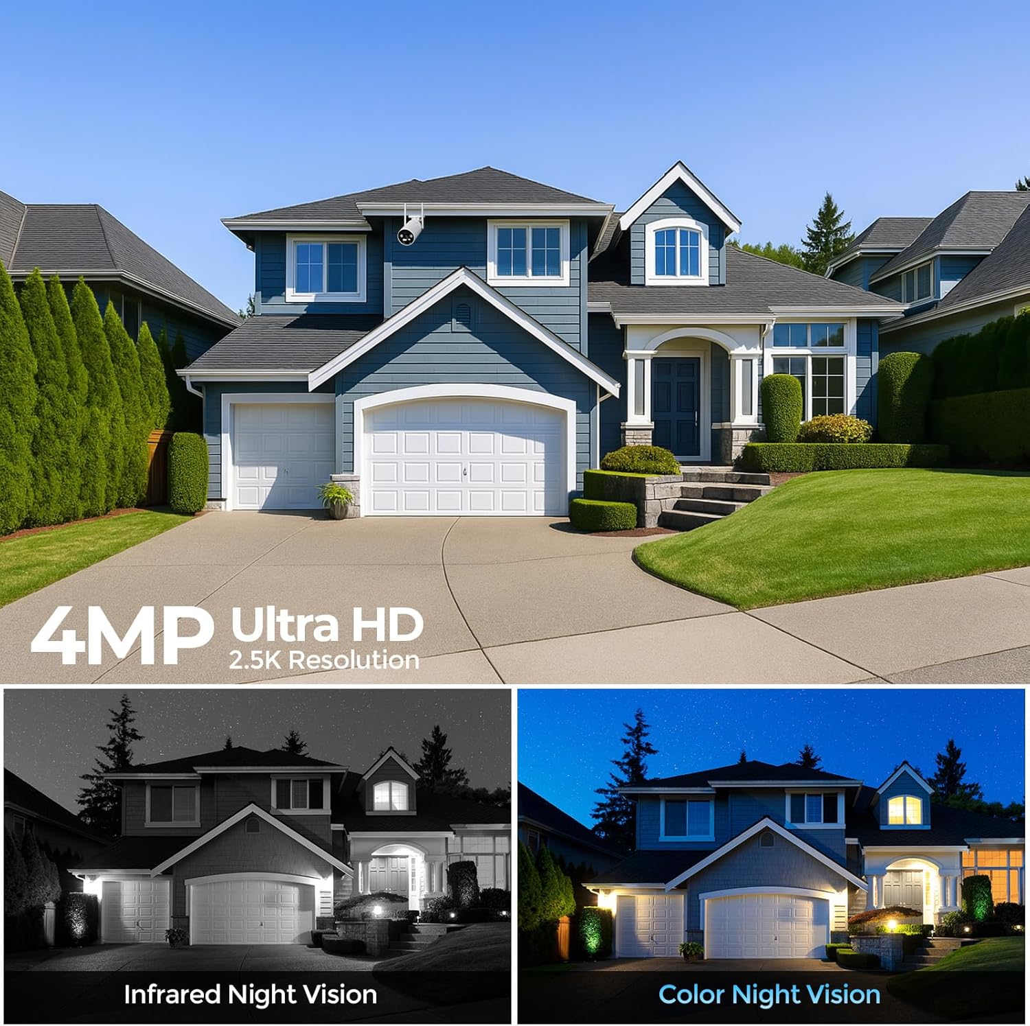 【4MP Ultra HD & Full-Color Night Vision】See every detail clearly with our advanced outdoor solar camera featuring 4MP ultra-HD resolution (2592×1944P), 10x digital zoom, and a 4mm lens for crystal-clear monitoring. The full-color night vision illuminates up to 65 feet, letting you watch your property in vivid detail even in complete darkness – no more grainy black-and-white footage! Home security system perfect for monitoring driveways, backyards, or porches.