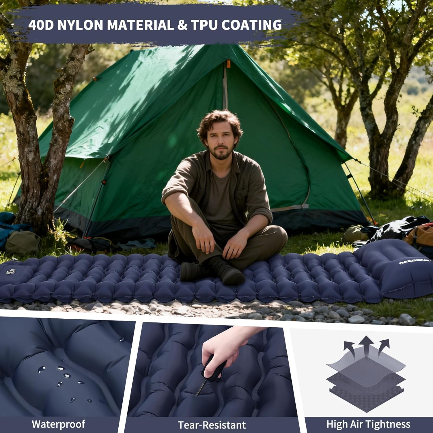 【Camping-Grade Durable Material】 Made from 40D nylon with a TPU coating, this inflatable mattress is highly wear-resistant, tear-resistant, and easy to clean, with excellent load-bearing capacity. The edges of the camping mat are rigorously heat-sealed to prevent air leaks and tears, ensuring reliability even under harsh conditions.