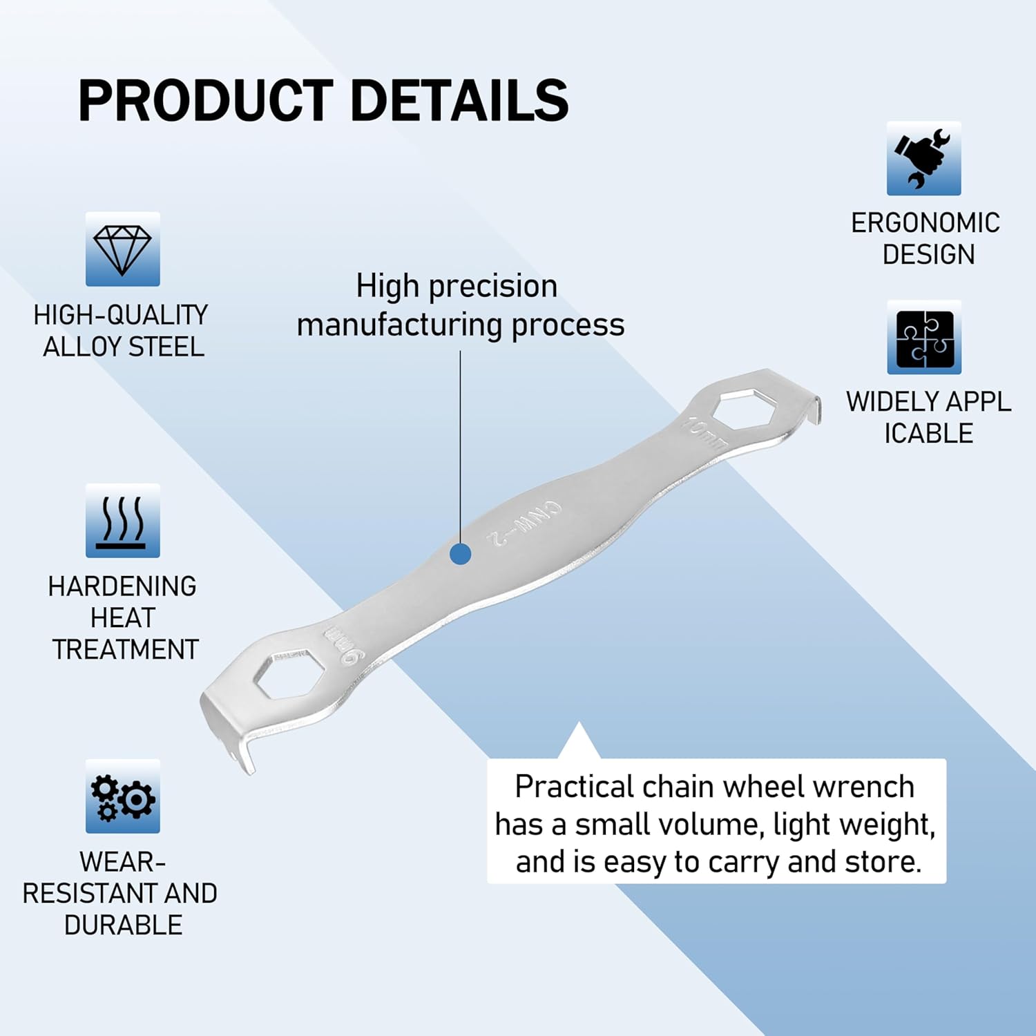 The chainring nut wrench is made of high quality steel material and through hardened heat treatment, which is very durable for long-term use