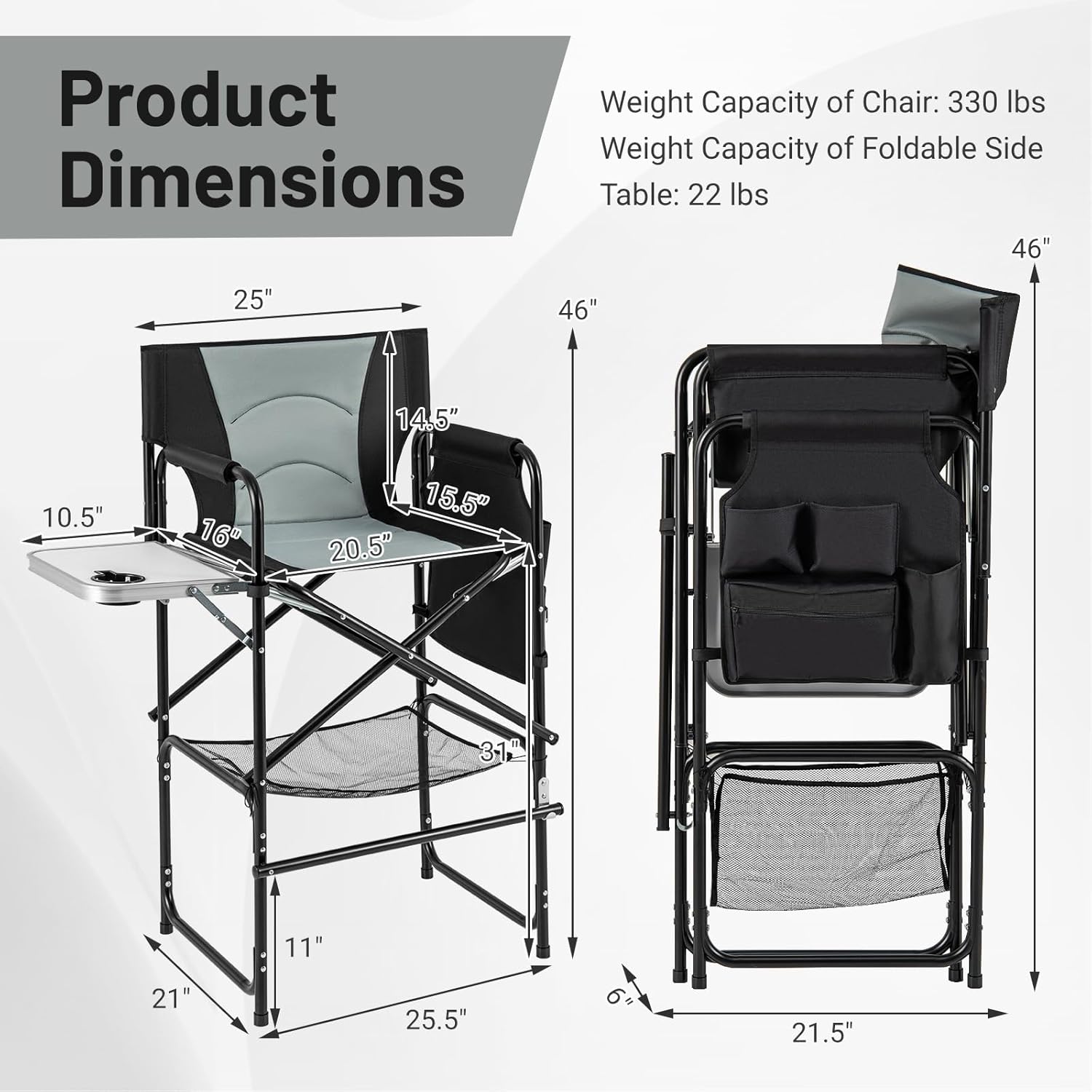 COSTWAY 46″ Tall Directors Chair, Folding Makeup Artist Chair with Foldable Side Table & Footrest, Extra Cup Holder, Bottom Mesh Bag & Storage Pocket, Camping Chair for Lawn & Yard, Black+Gray