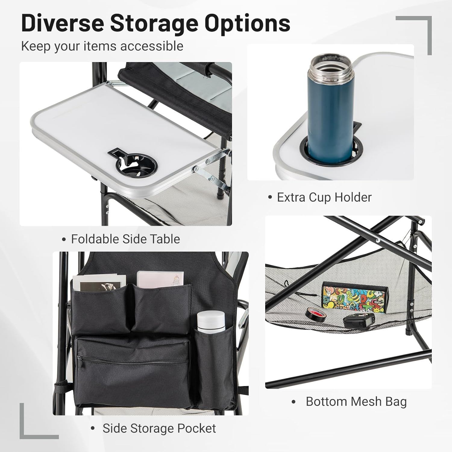 [Diverse Storage Options] The foldable side table with an extra cup holder allows you to store food or beverages, which will keep your items accessible. The directors chair also comes with a bottom mesh bag and side storage pocket for your magazines, phones, and other items.