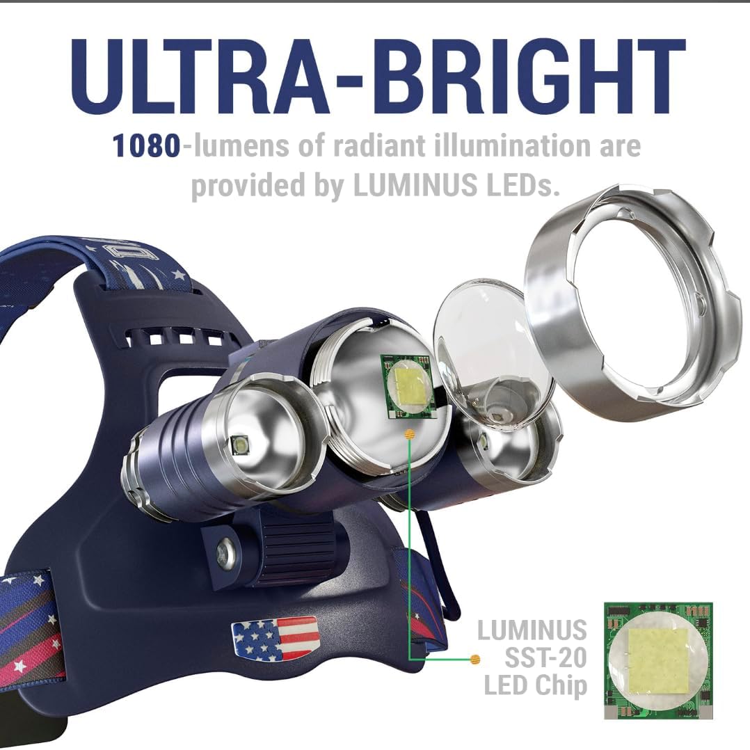 DanForce Headlamp. USB Rechargeable LED Head Lamp. Ultra Bright LUMINUS 1080 Lumen Head Flashlight + Red Light. HeadLamps for Adults, Camping, Outdoors & Hard Hat Work. Zoomable IPX54 Headlight