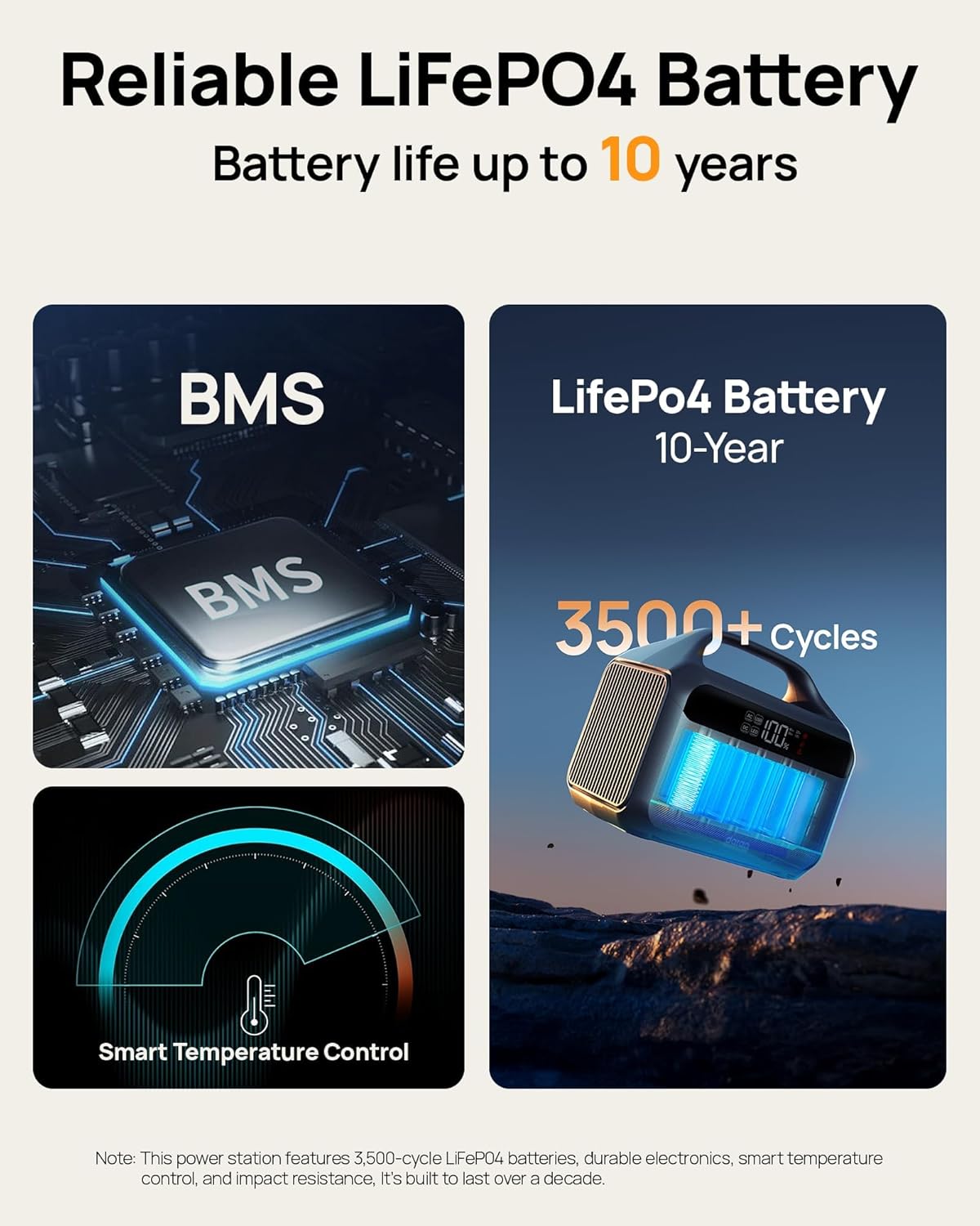 【Long-Life LiFePO4 Battery】Built with automotive-grade LiFePO4 cells, this solar generator lasts up to 6× longer than traditional lithium-ion models, offering over 3500 charge cycles. A smart BMS provides complete protection against over-voltage, over-current, overheating, and short circuits.