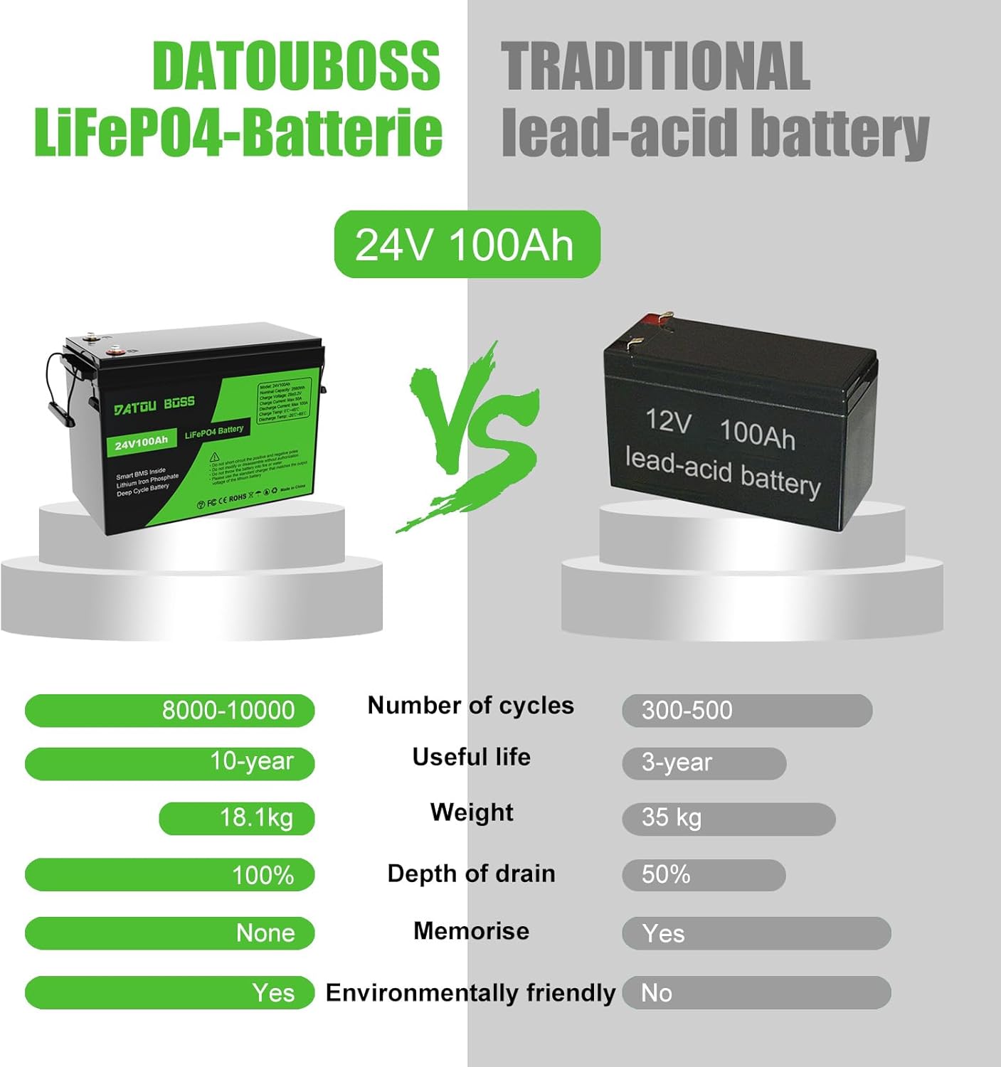 DATOUBOSS LiFePO4 Battery 24V 100Ah 2560Wh, 6000+ Cycles at 80% DOD Lithium Iron Phosphate Rechargeable Battery with 100A BMS Protection, Perfect for Solar, RV, Off-Grid Systems and Energy Storage