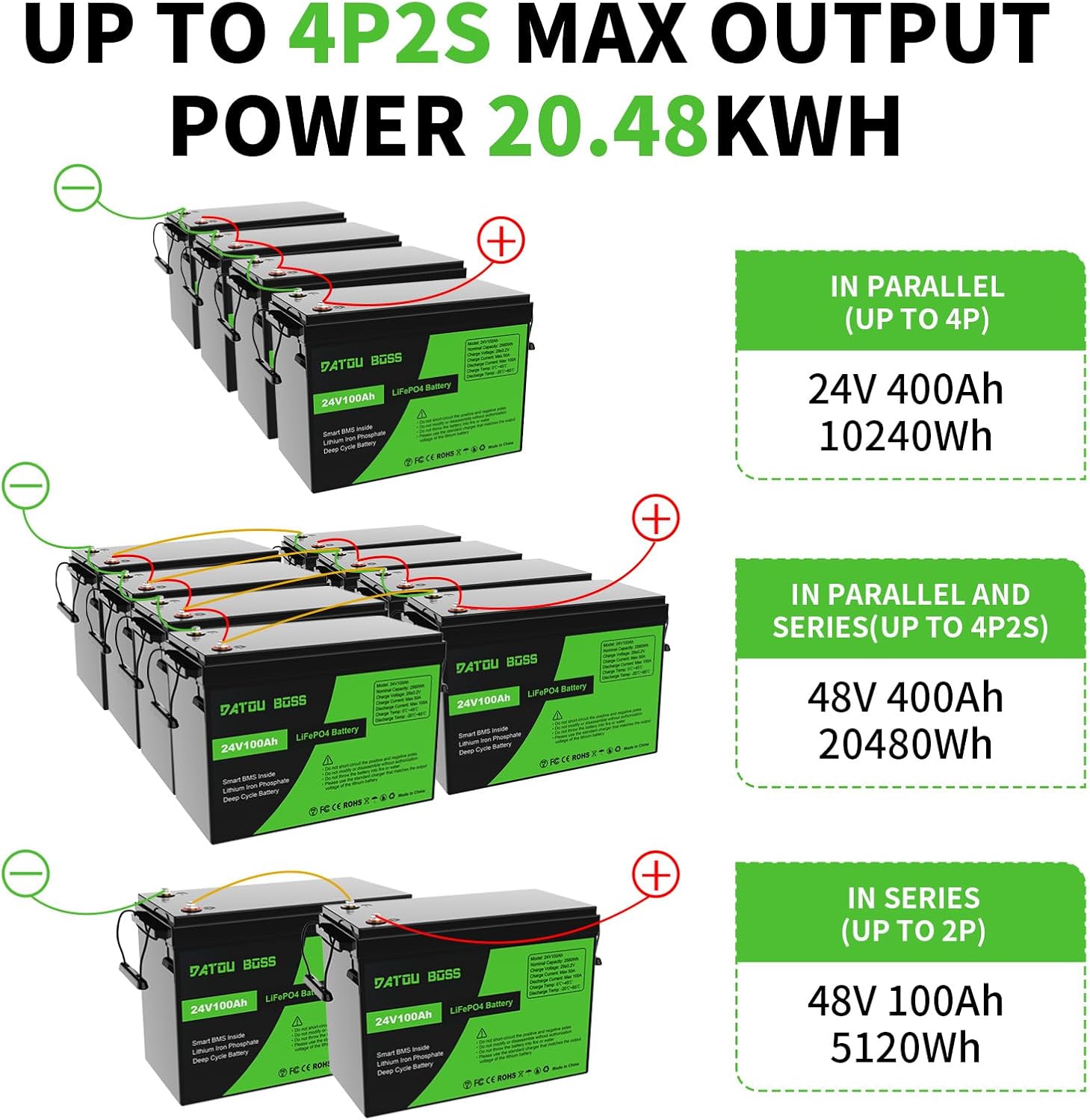 Expandable Battery System Support up to 2S4P:The battery supports scalable configurations up to 2S4P, allowing flexible expansion to meet higher capacity or voltage requirements for solar and off-grid power systems. An integrated smart BMS provides protection against overcharge, over-discharge, overcurrent, short circuit, and temperature-related conditions. Compatible with appropriate LiFePO4 battery chargers.