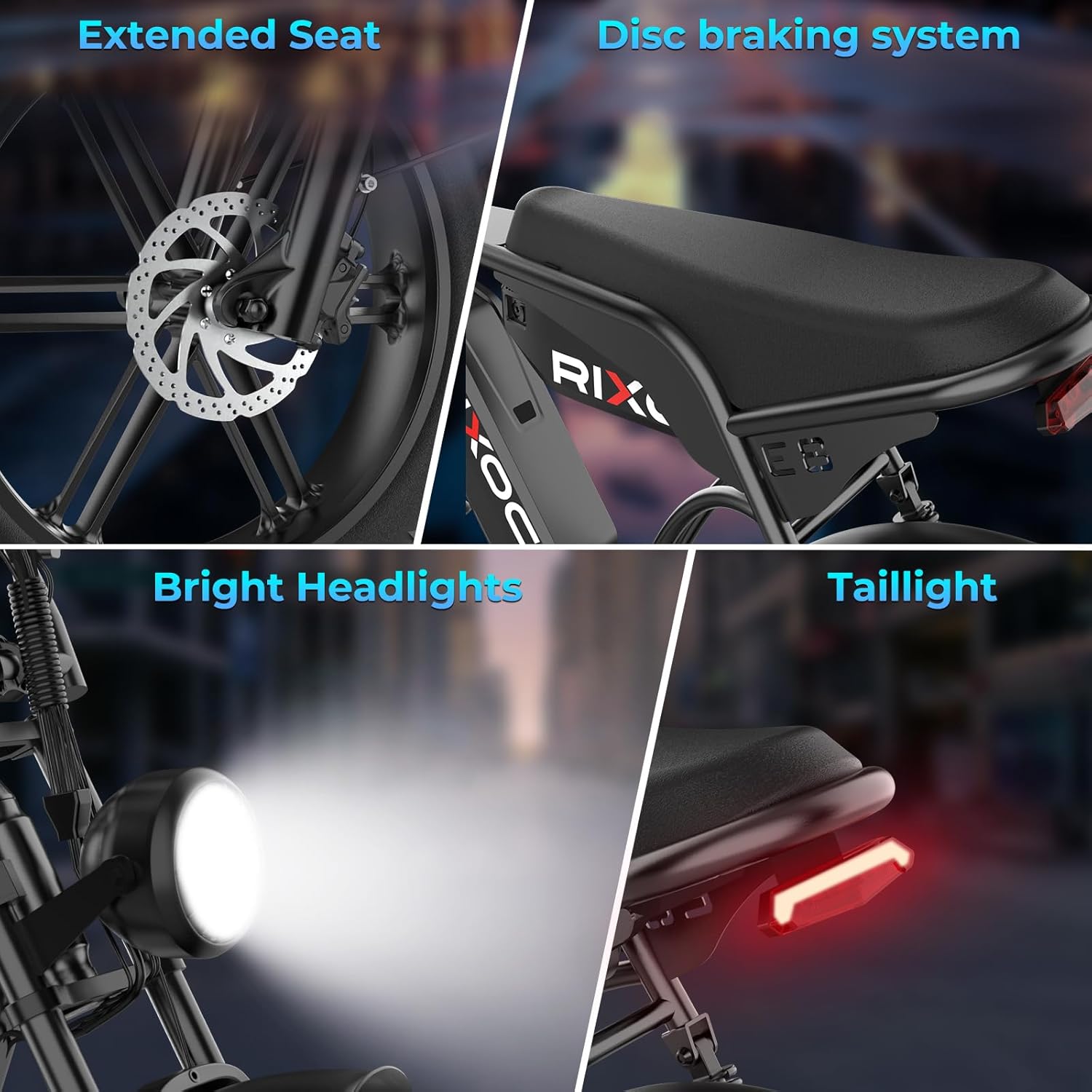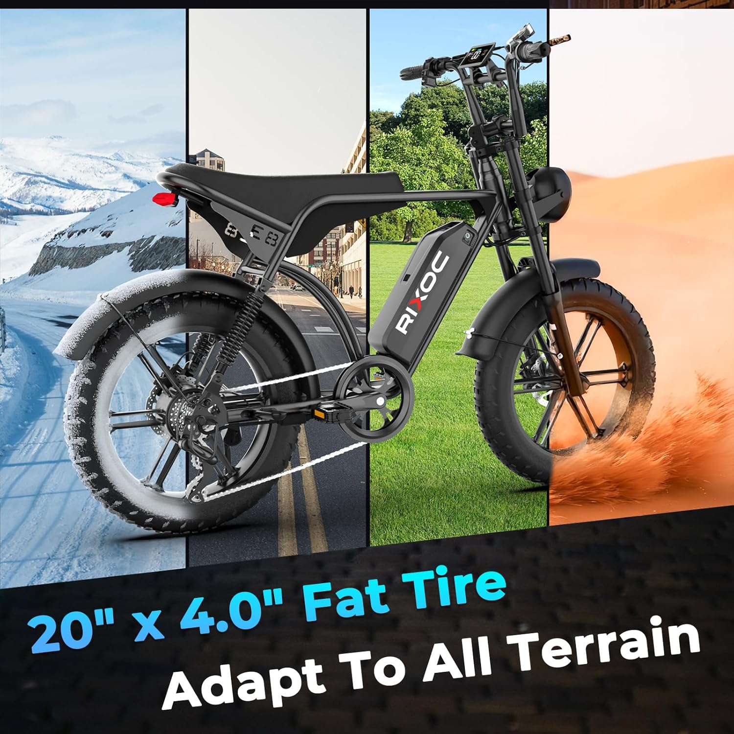 【Safety Certification & Premium Quality】The Rixoc E8 electric bicycle has UL certification and IPX5 waterproof rating, meeting top safety and quality standards. Its strong wide tires, durable frame and high-grade components offer great stability and dependability. Designed for diverse roads, it consistently provides reliable safety protection and a comfortable ride — Choose Rixoc, and every journey is steady, worry-free and smooth.