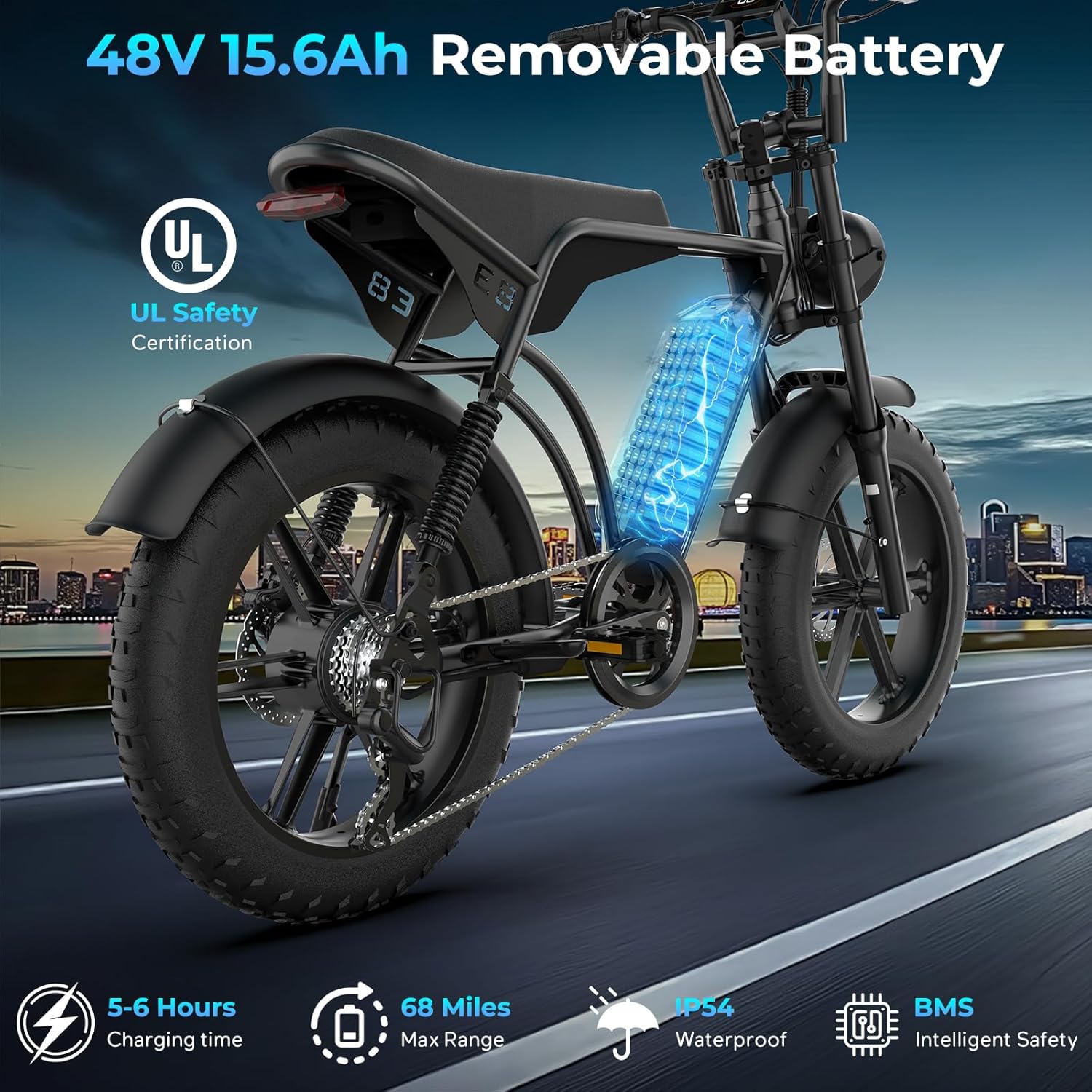 【Removable 48V 15.6AH Battery】The Rixoc E8 electric bicycle for adults is equipped with a Battery Management System (BMS), which can prevent overcharging, overheating and short circuit to ensure safety. When the battery is fully charged (with a charging time of about 6 hours), it offers a range of approximately 68 miles. In addition, the battery has passed UL certification and features an IP54 waterproof rating.