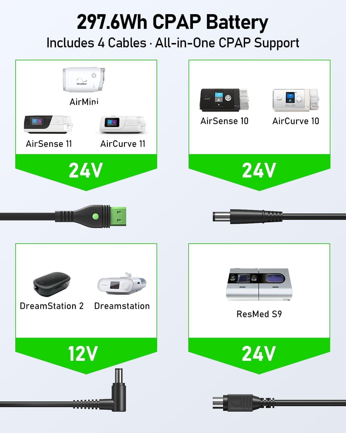Off-Grid CPAP Battery – Includes 4 CPAP cables, compatible with ResMed S9, AirSense 10/11, AirCurve 10/11, AirMini, Philips DreamStation 1/2, and Luna G3 (heated tube not supported).