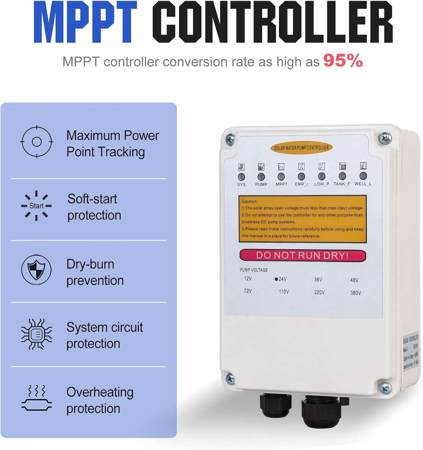 【Smart Automated Operation】 – MPPT controller and liquid level sensor enable fully automatic operation. Pump stops when tank is full or well water is too low.