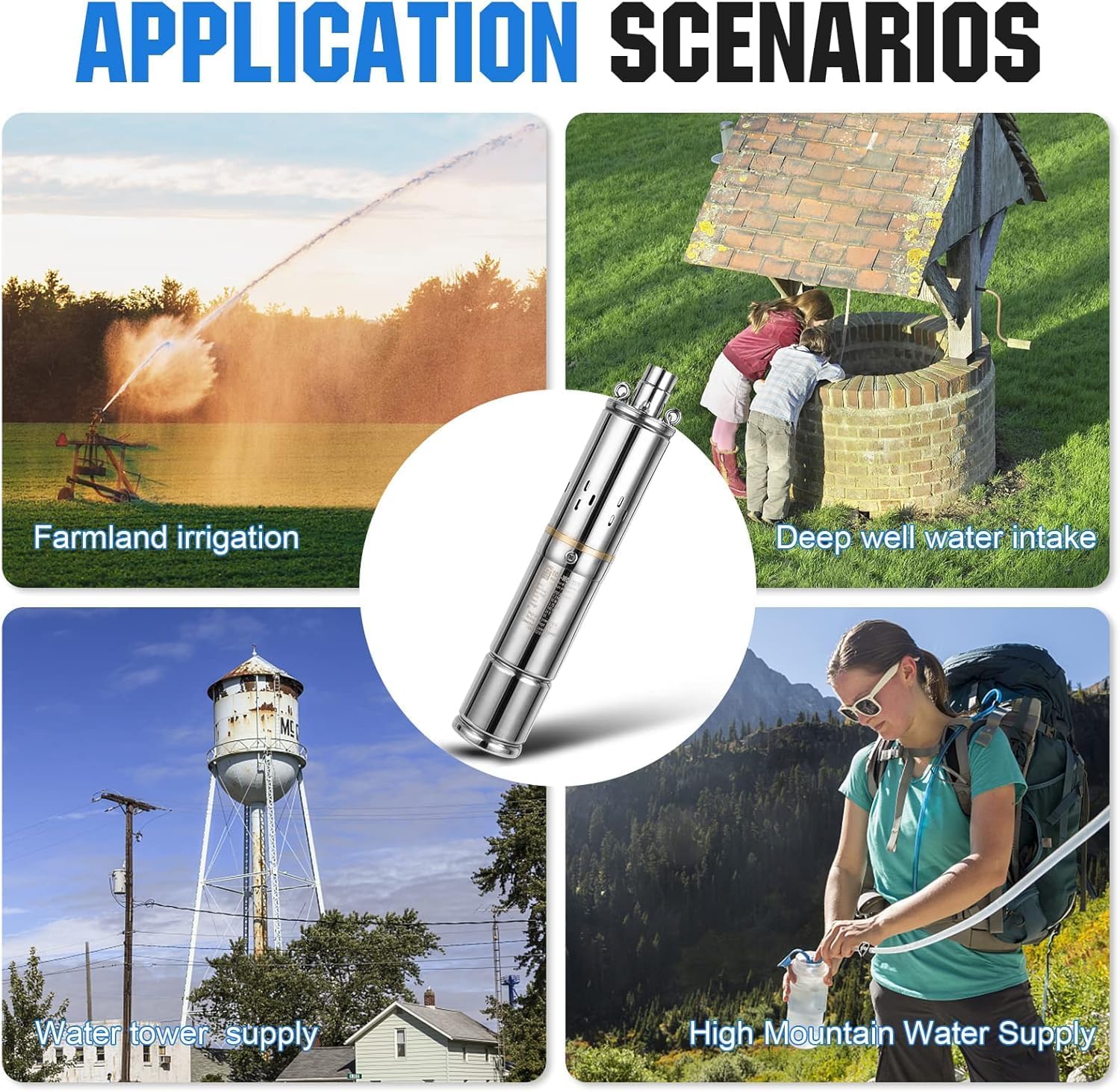 【All-in-One Solar Well Pump Kit】 – Includes 4x100W solar panels, a 3-inch deep well pump with built-in MPPT controller for connecting solar cables and liquid level sensor.