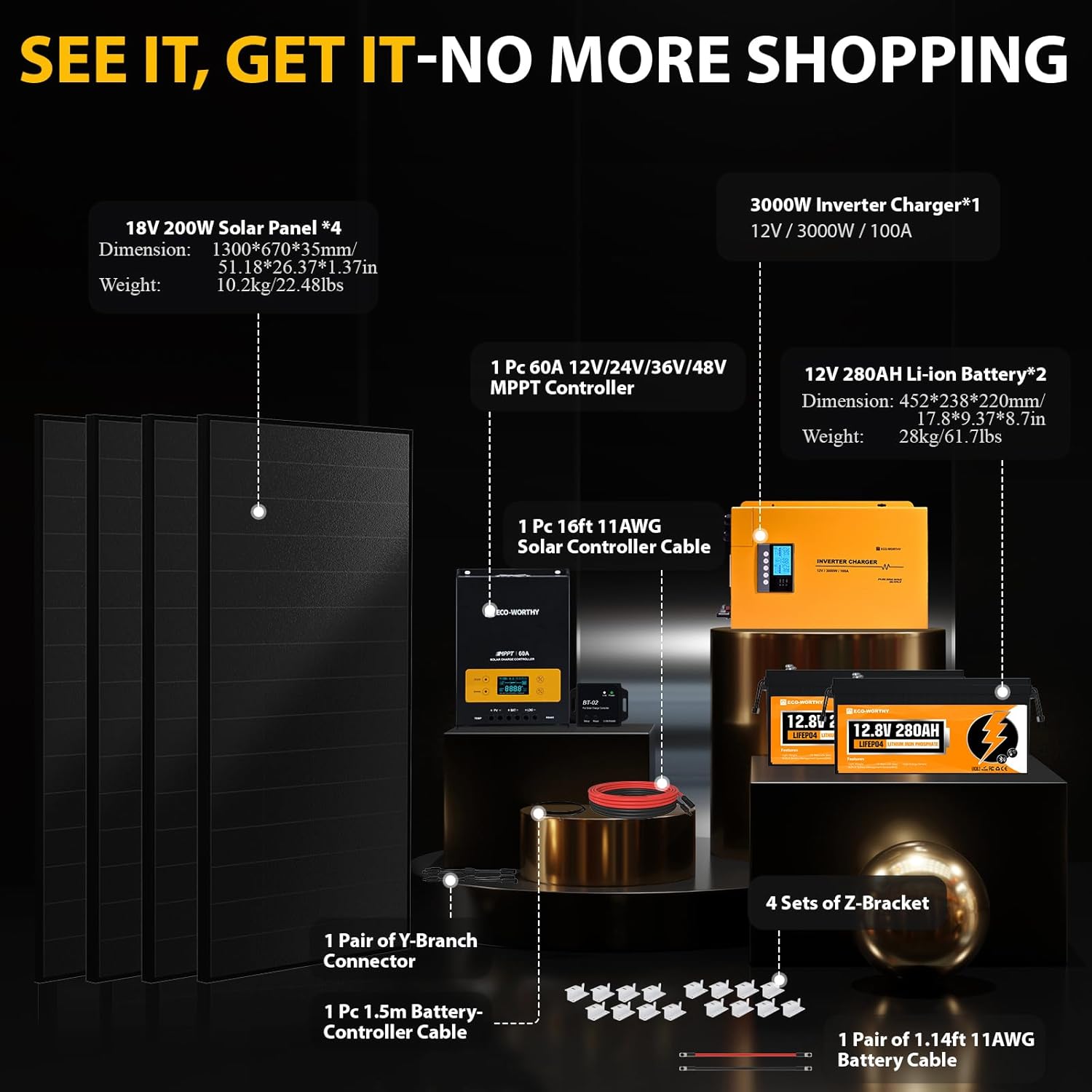 ECO-WORTHY 7.168KWH 800W Solar Panel Kit for RV Off Grid Complete System with 4PCS HPBC 200W Solar Panels, 3000W UPS Inverter Charger, 2PC 12.8V 280AH Lithium Batteries, 60A MPPT Controller Bluetooth