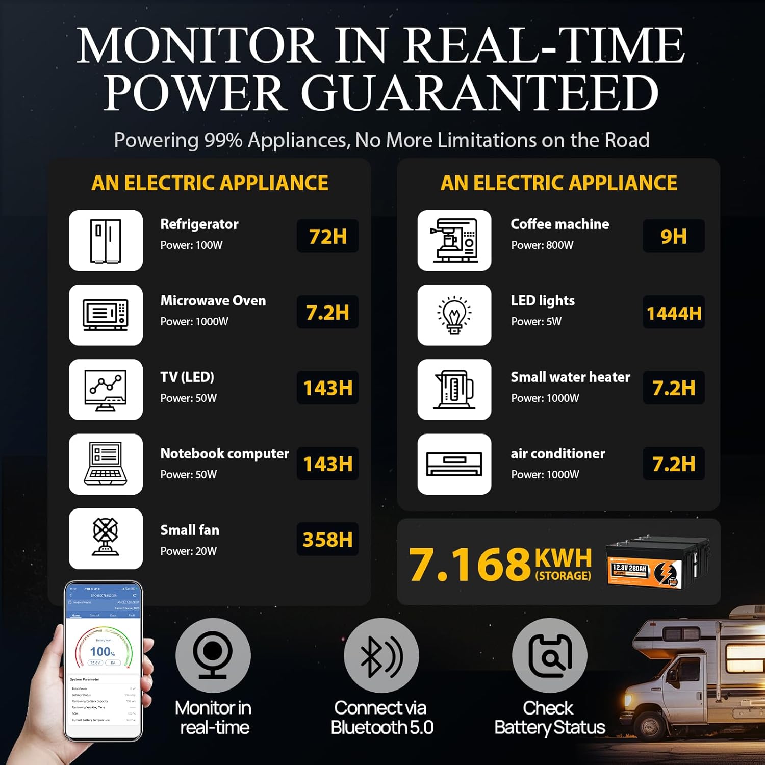 【Worry-free Power】Equipped with 4PCS 200W bifacial solar panels equipped with 25.2% High-Efficiency Solar Cell, 4 hours of sunlight per day can generate 3.2 kWh of electricity, and the battery can store up to 7.168 kWh of electricity. The system can power 99% of RV appliances, including refrigerators, air conditioners, microwave ovens, TVs, fans, coffee machines, LED lights, and water heaters. It is perfect for off-grid adventures, providing reliable and sustainable energy for your RV needs