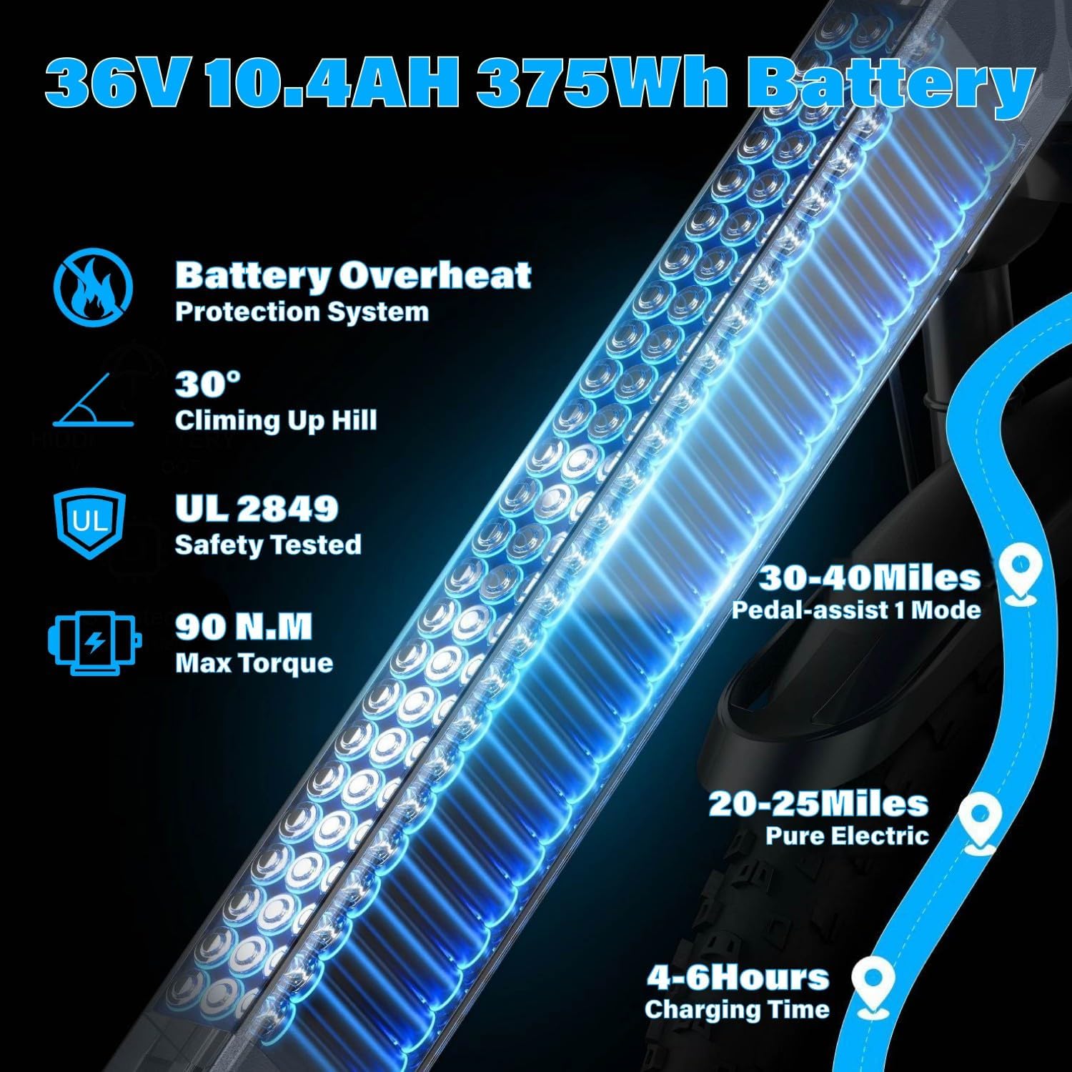 375Wh Battery:Powered by a 375Wh IPX5 waterproof lithium battery,electric mountain bike allows you to achieve a range of 20-25 miles in pure electric mode and 30-40miles in pedal-assist mode,depending on your weight and road conditions.It can be fully charged about 4-6 hours.Please Note:Choose the right size before purchasing.