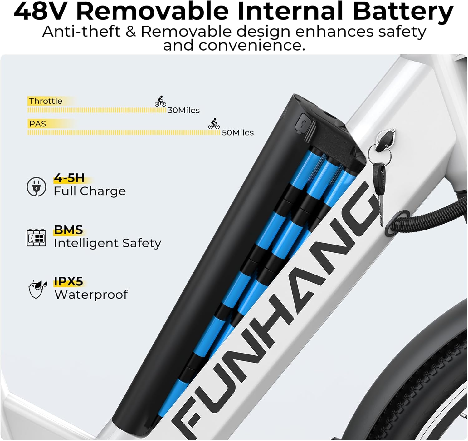 48V BUILT-IN REMOVABLE BATTERY: Funhang commuter electric bicycle adopts a 48V 374.4WH IPX5 waterproof lithium-ion battery, this allows you to confidently travel 40-50miles in PSA mode and 20-30 miles in throttle mode on a single charge, without worrying about running out of power. Riding range varies depending on the battery, riding style, rider weight and road conditions. The integrated removable battery with BMS system ensures safe and easy charging at home or in the office.