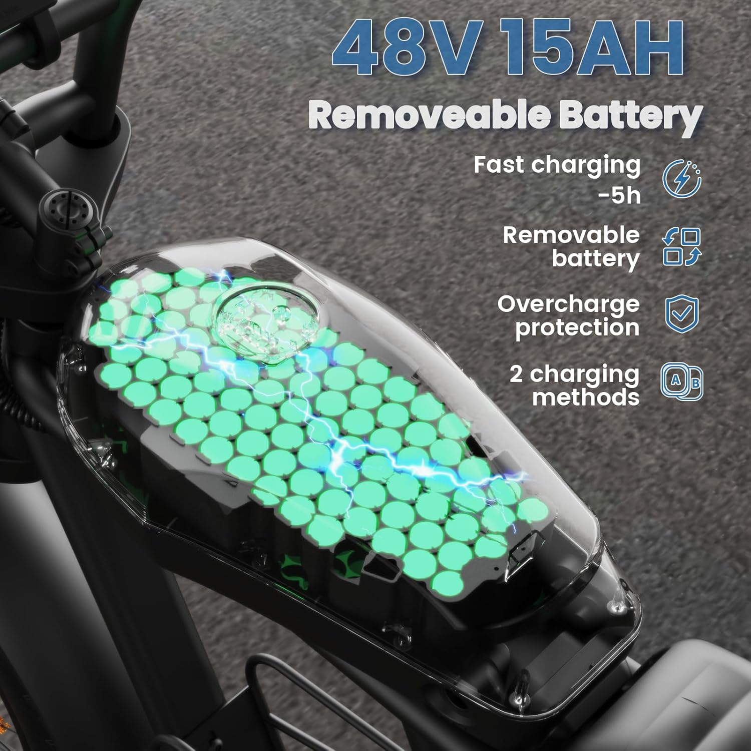 Ride farther with confidence thanks to the 48V 15Ah large-capacity battery, offering up to 38 miles per charge, ideal for long-distance rides, weekend adventures, and daily use.