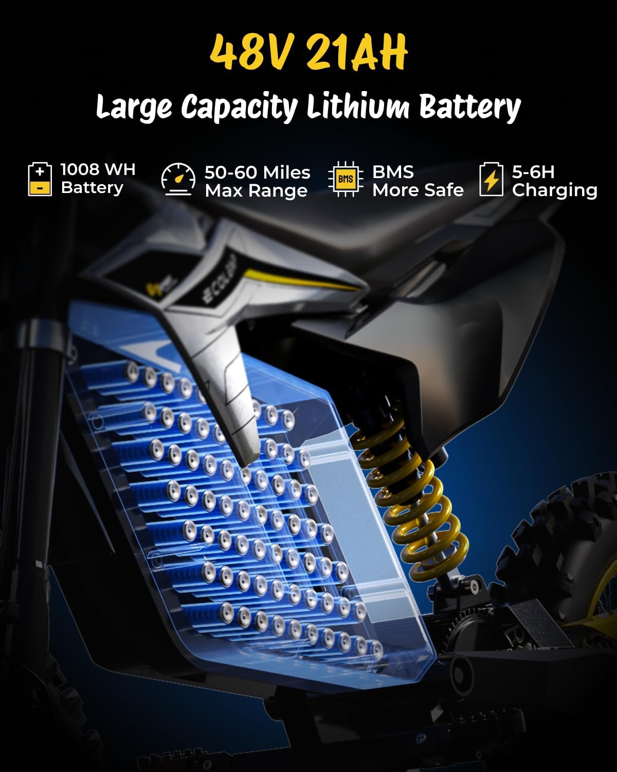 【46.8Vdc, 20.8Ah Long-Range Battery with BMS Protection】 Equipped with a 46.8Vdc, 20.8Ah battery, offering an estimated 50–60 miles per charge depending on rider weight, speed, terrain, and temperature. Built-in BMS safety system helps protect against overcharge and overheating. Full charge takes approximately 5–6 hours, so you can spend more time riding and less time waiting.