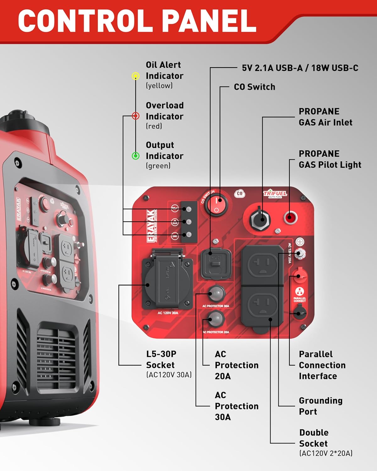 ERAYAK 4500W Dual-Fuel Portable Inverter Generator for Home Use, Camping Outdoor, 30A RV Ready, Auto Switch, Gas and Propane Powered, EPA, CO Sensor, Parallel Ready, Campact Design