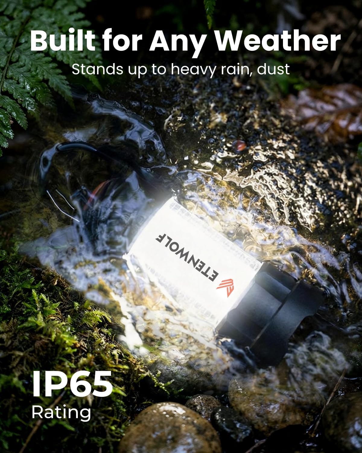 LIGHTWEIGHT AND PORTABLE: ETENWOLF lantern flashlight just 7 oz (208 g), is easy to pack and carry. The camping light built with a tough, drop-resistant body and IPX5 waterproof rating, it’s designed for rugged outdoor use.The hanging hook allows you to easily hang the lantern inside tents, on branches, or backpack for hands-free lighting