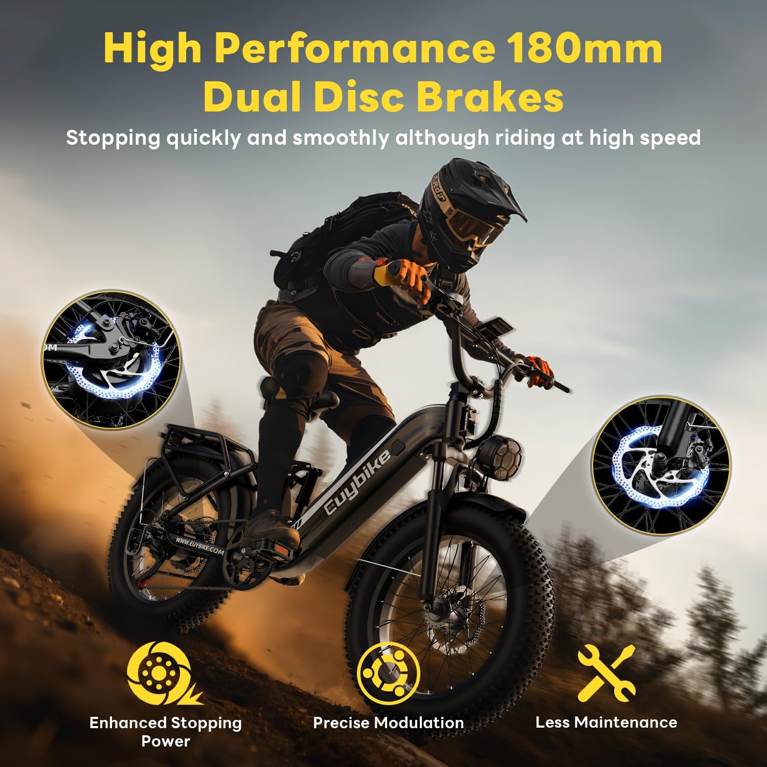 【Full Suspension and 20″x4 fat tires】: Features a front suspension fork and four-bar linkage rear suspension, which absorbs most of the bumps and vibrations during riding, 20″ x 4″ fat tire has excellent grip on all-terrain, ensure the vehicle’s stability and comfortable riding experience, easily handle any adventure in all terrain.