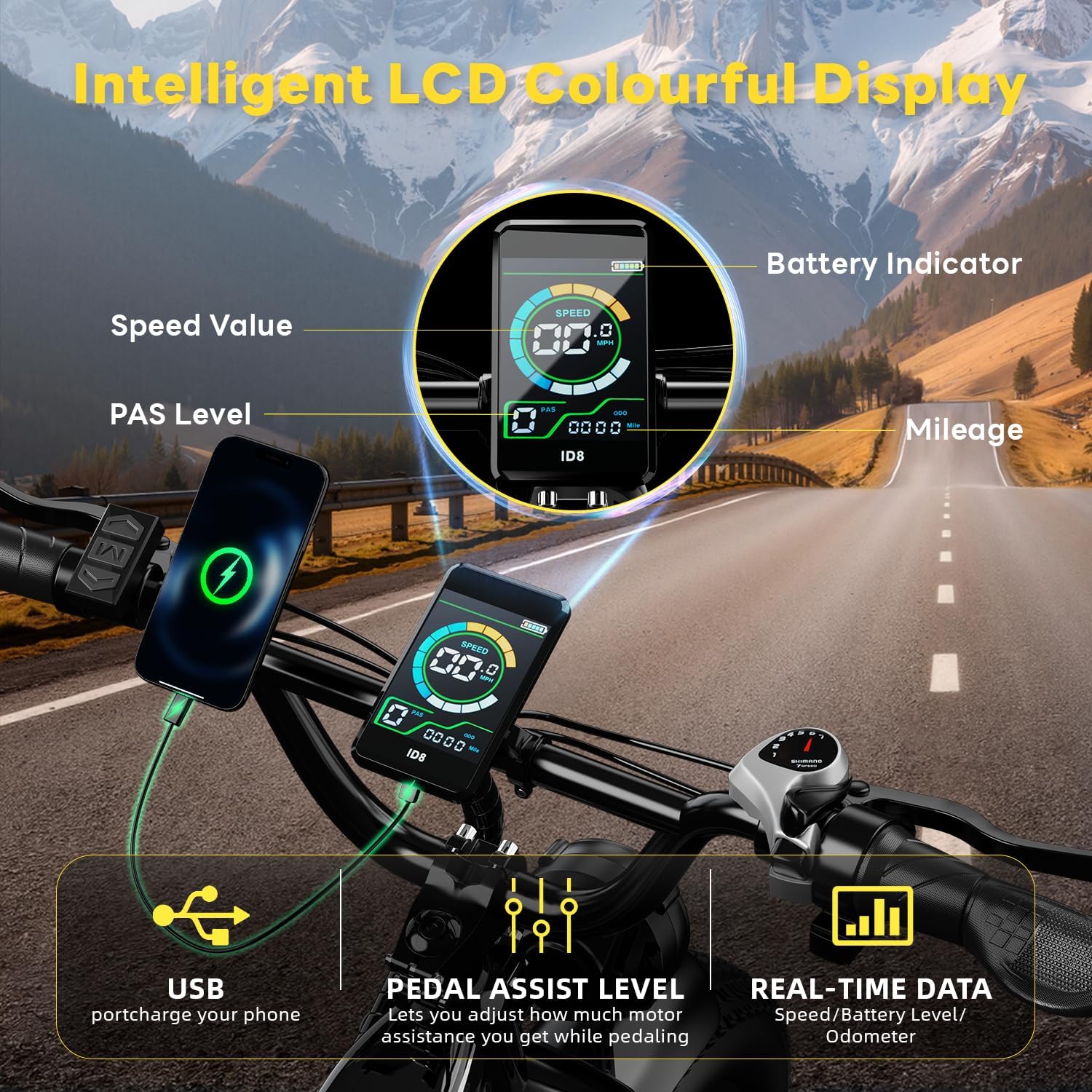 【Personalized Riding】: Adopts a new step-thru design, which maintains the strength of the original frame and has a lighter weight, and convenient for riders of different heights to get on and off. This intelligent LCD display offers you a clearer and more comfortable visual experience, and keeps track of real-time speed, battery level, pedal assist level,mileage and other stats precisely, perfect your exercising and commuting. Equip with USB charging port,it can charge your dying cell phone.