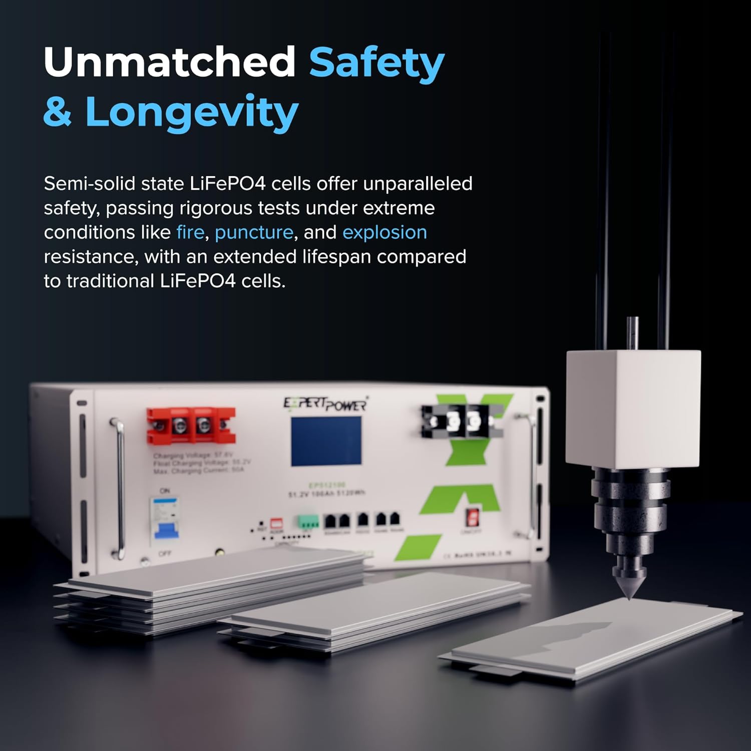 New Ultra-reliable Semi-Solid Technology: Our new Semi-Solid LiFePO4 batteries boast an impressive lifespan of 5000 to 10000 cycles over 15 years. Equipped with our newest and most advanced Battery Management System (BMS), it’s safeguarded against overcharging, deep discharges, overloads, overheating, short circuits, low-temperature cut-off, and boasts an exceptionally low self-discharge rate while keeping you connected to monitor your batteries wherever you are via Wi-Fi or Bluetooth.