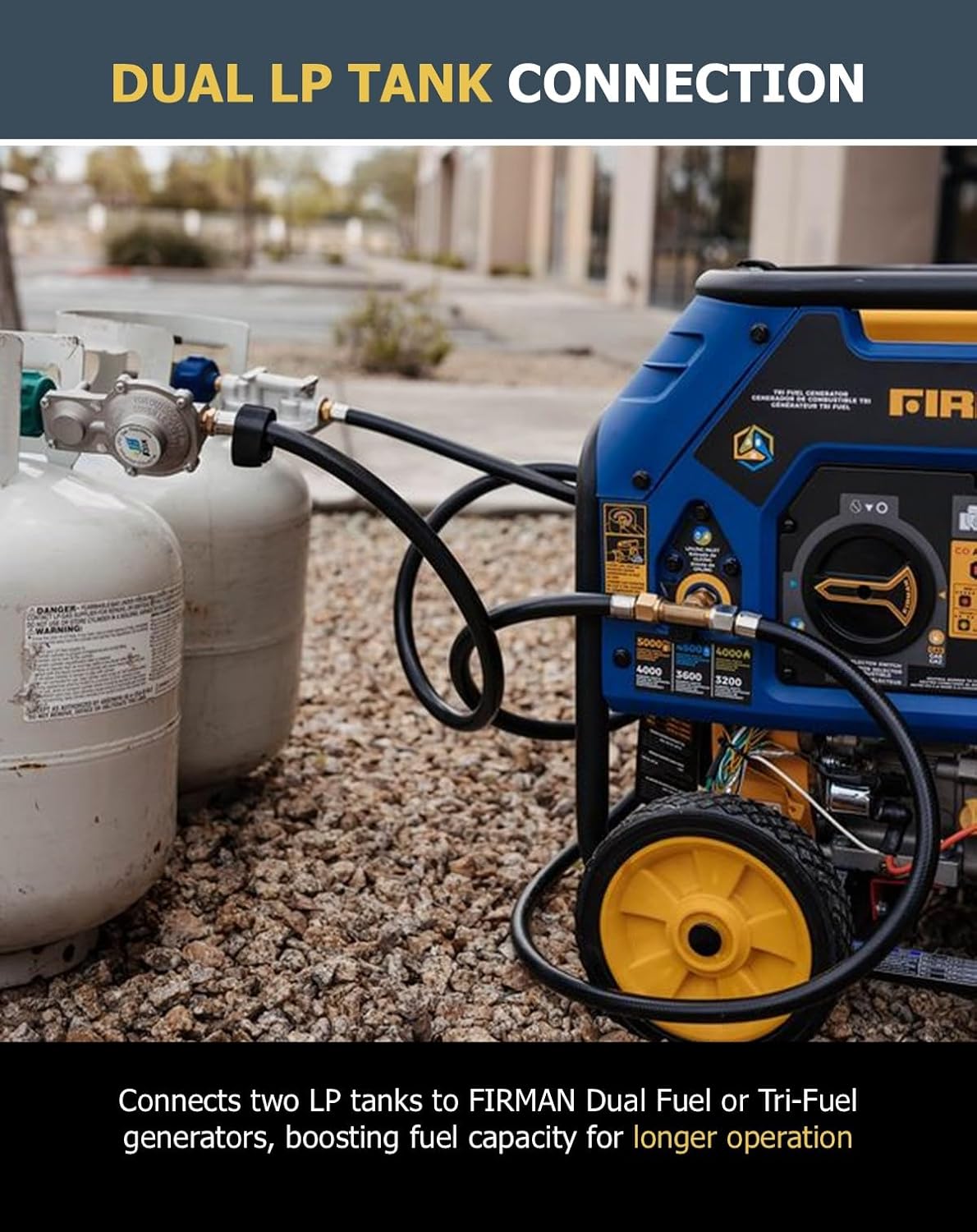 Connects 2 LP Tanks to FIRMAN Dual Fuel or Tri-Fuel Generators, extending fuel capacity for longer runtime during outdoor events, camping, or backup situations