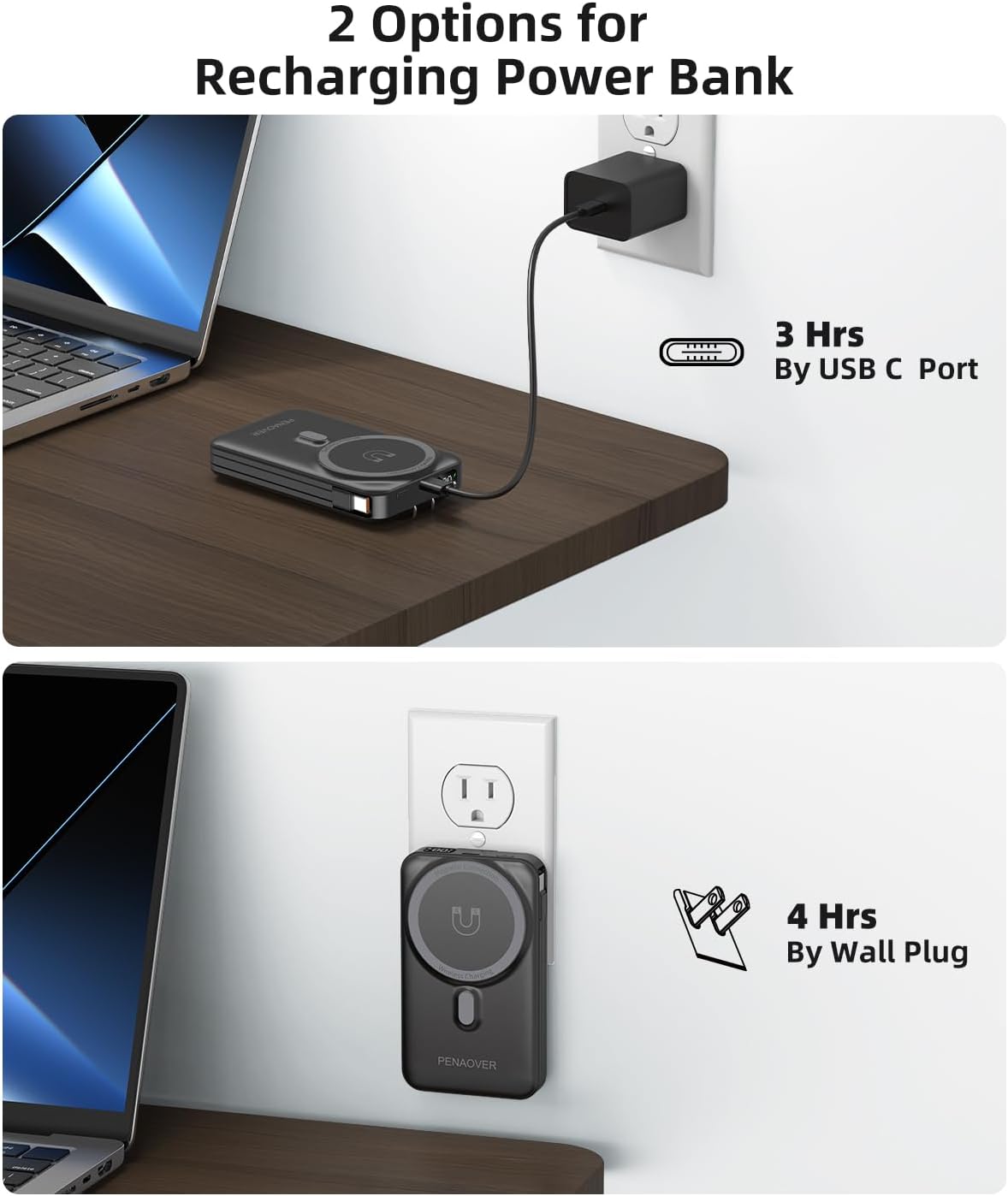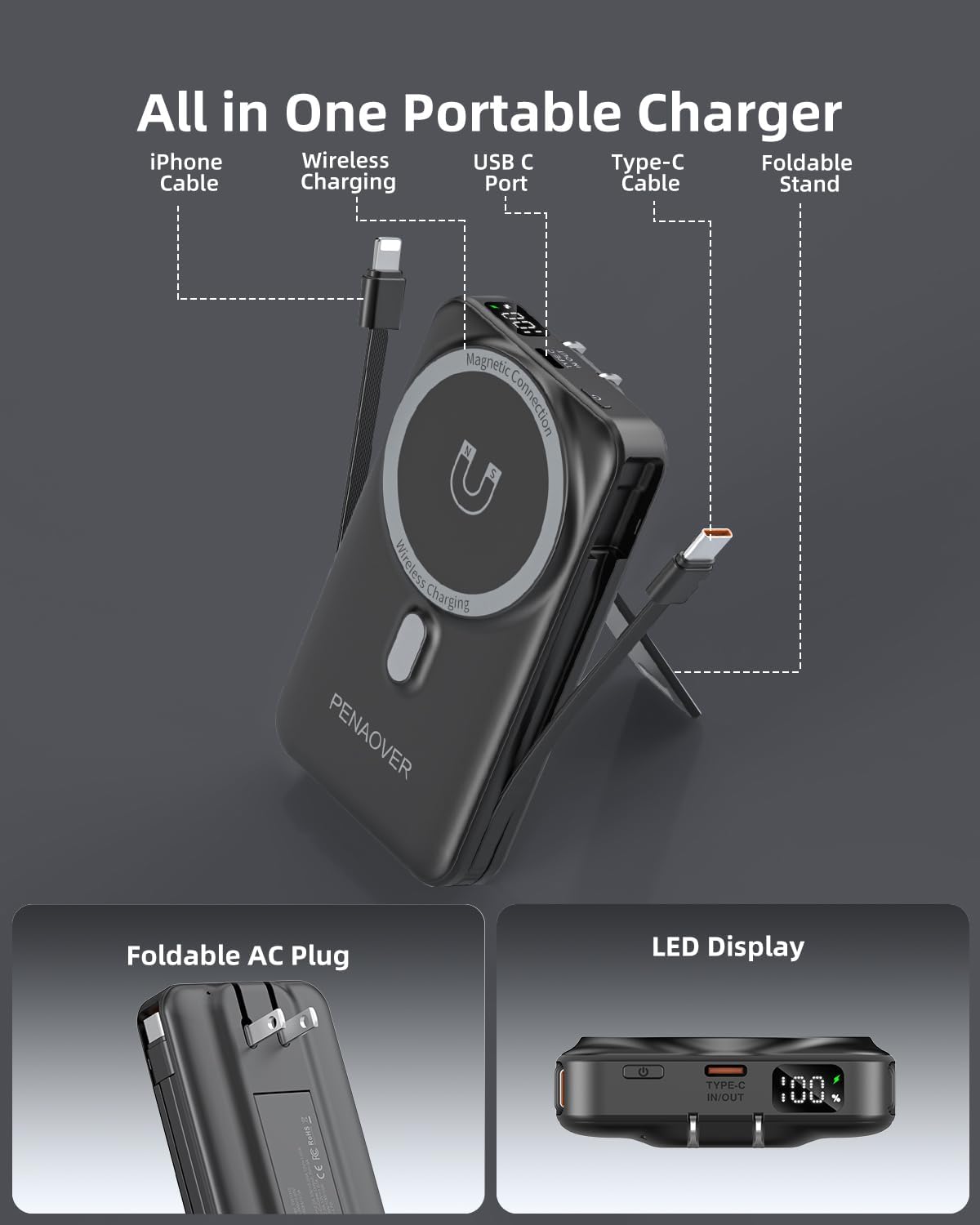 All in One Power Bank: Penaover power bank has 4 output: wireless charging, type-c cable, iphone cable and usb c port. 2 input: AC wall plug and usb c port. Provide on-to-go charging. No need to carry any adaptor or charging cables, travel essentials.(Airline approved)
