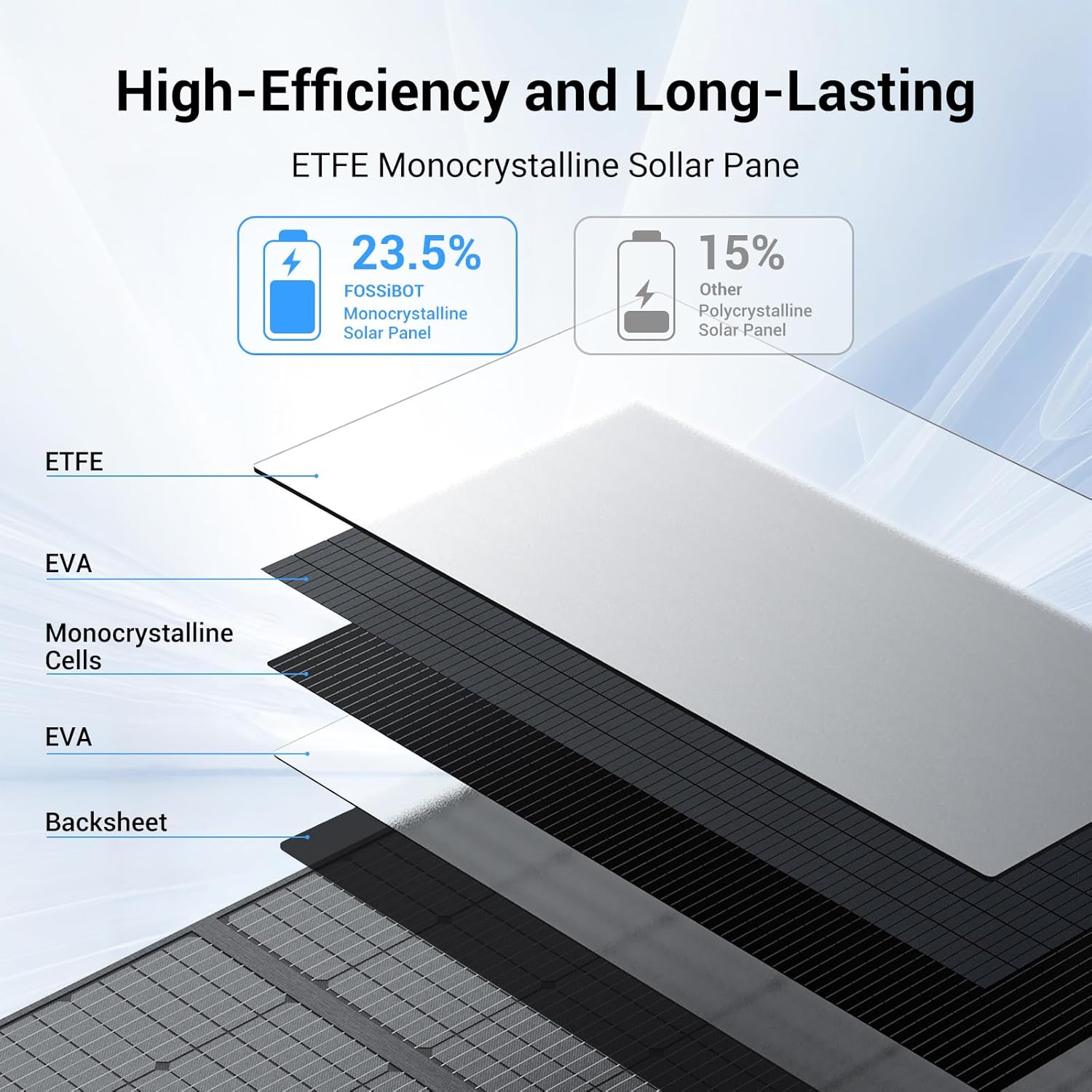【High Cell Efficiency】Built with monocrystalline solar cells, SP420 solar panel can convert up to 23.4% of the sunlight into usable electricity, giving you solar energy even in bad weather.