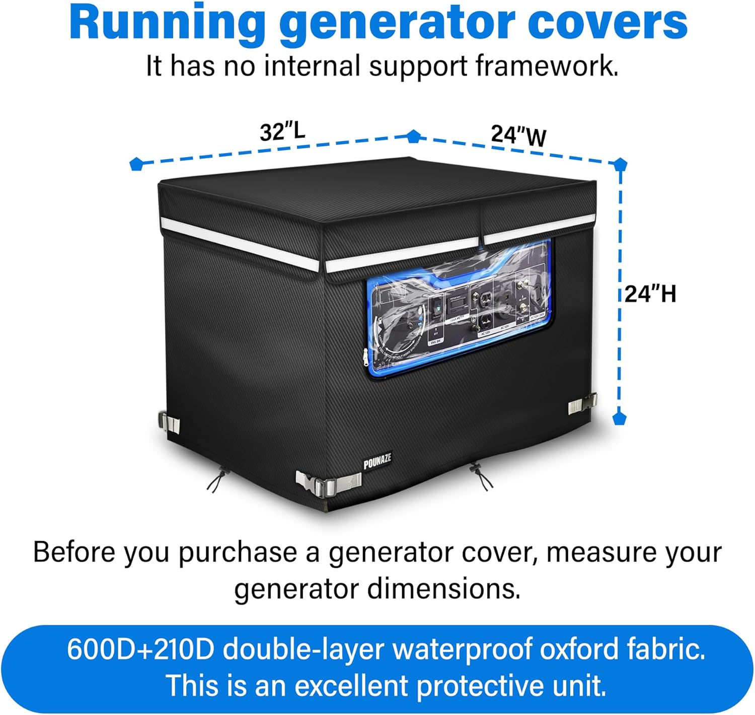Generator Covers While Running. Generator Cover Measures 32”Lx24”Wx24”H. Double-layer Fabric. Side Access to Control Panel and Top Access to Add Fuel. Fits Most 5,000-15000 Watt Generators, Black.