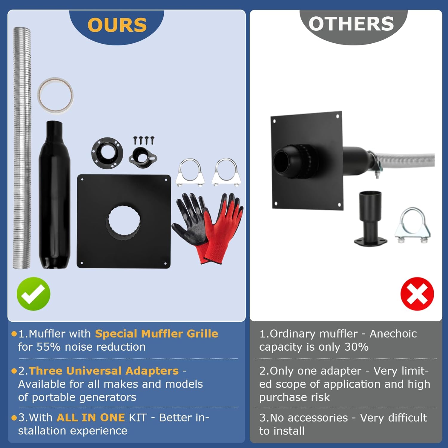 【ENHANCED COMPATIBILITY & RISK-FREE PERFORMANCE】 Our upgraded generator exhaust extension silencer kit is designed to fit a wide range of portable generators by including Three Universal Adapters that allow it to work with all brands and models. With the addition of an ALL-IN-ONE KIT, which includes fiberglass cloth foil tape for improved sealing, a pair of knitted rubber gloves, and self-tapping screws for wall mounting, our product offers greater versatility and reduces the risk of purchasing the wrong size. This flexibility ensures that your investment is protected, making our kit a risk-free choice compared to others on the market