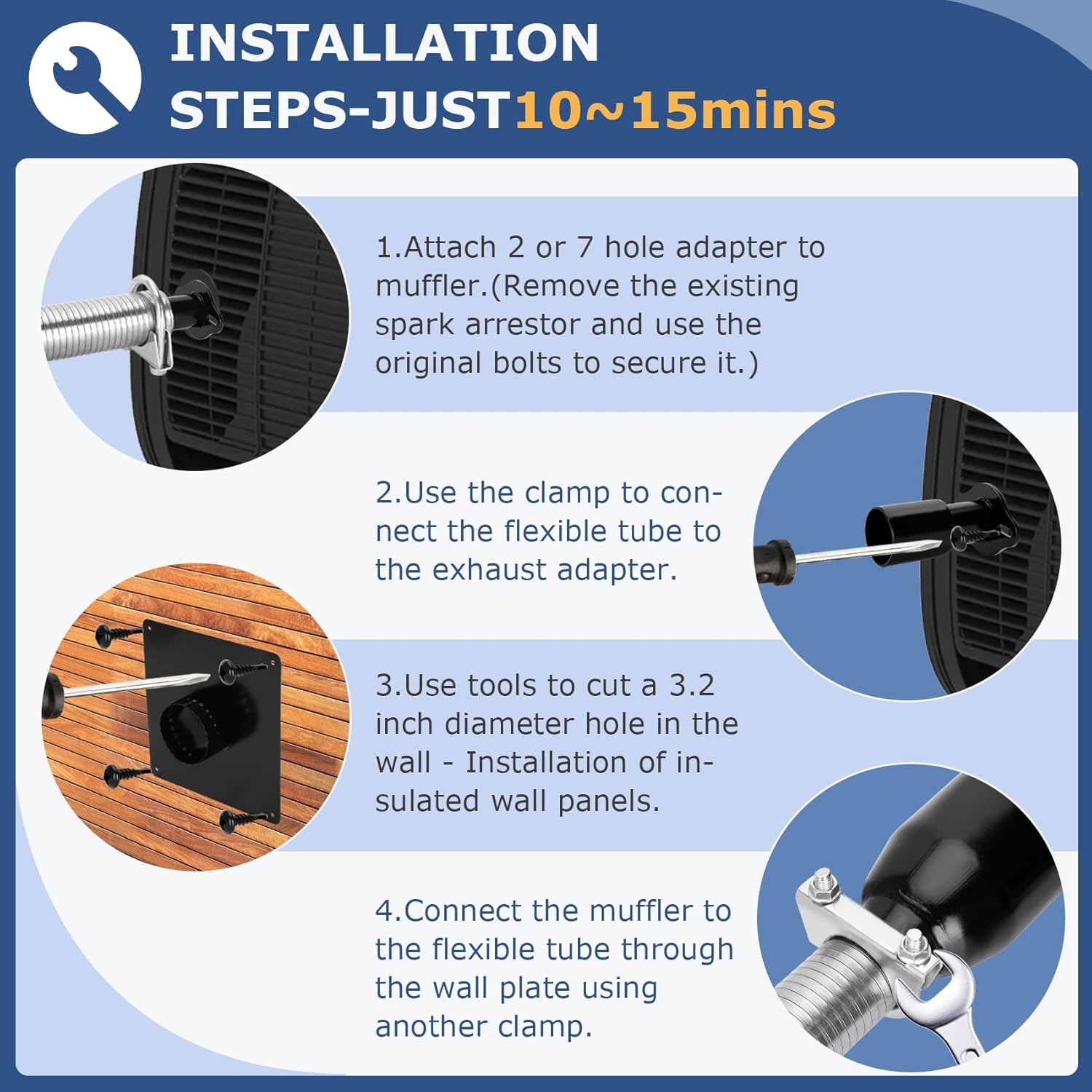 【EFFORTLESS INSTALLATION & QUICK SETUP】Our generator muffler silencer kit is designed for easy installation, taking only 10-15 minutes. Crafted from aerospace-grade alloy materials, the kit ensures superior durability and performance. The included insulated through-wall mounting plate allows you to extend your generator’s exhaust system through walls or barriers, enhancing both ventilation and safety. No extensive modifications to your generator shed are required, and the installation process is simple enough for both novices and experienced users alike