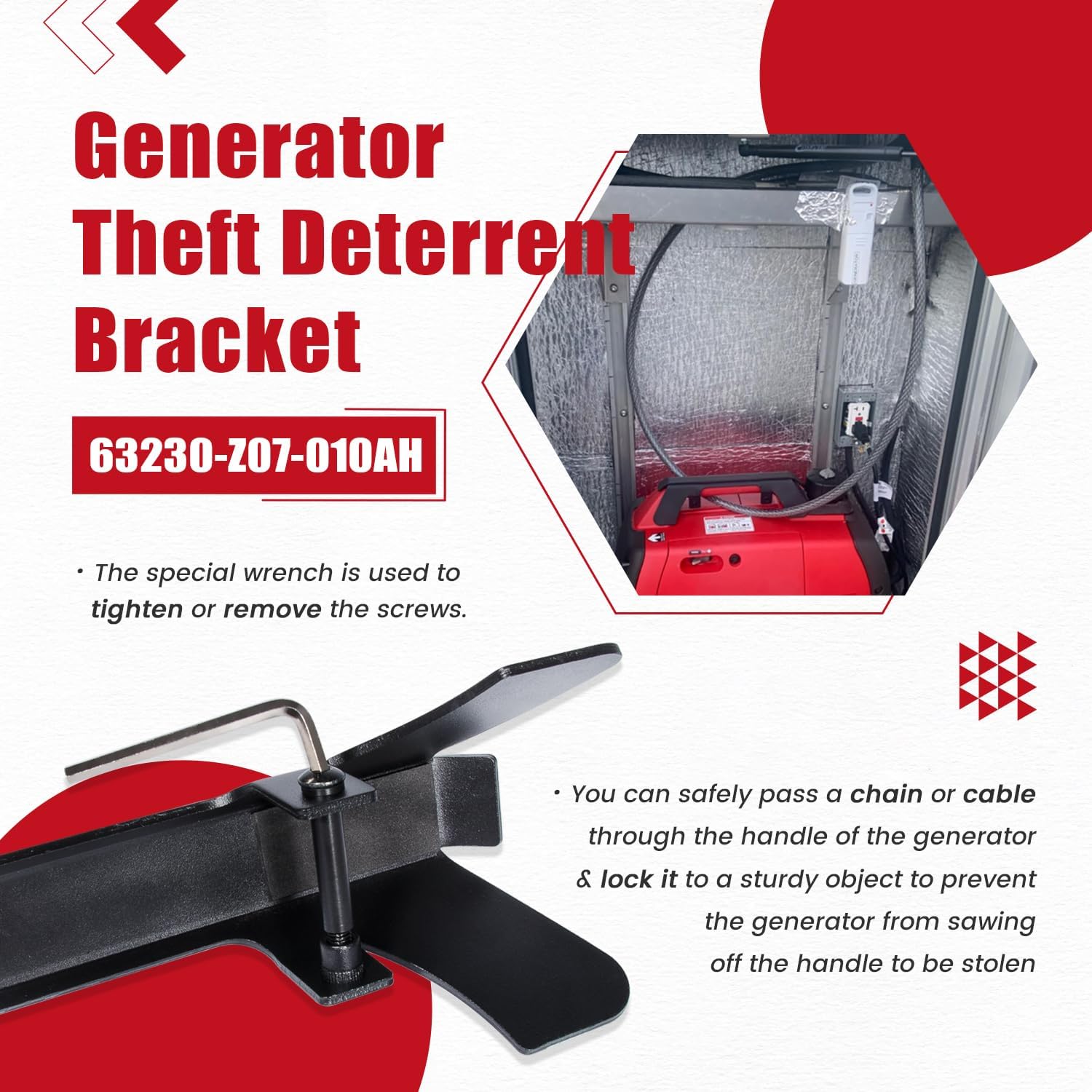 【Anti-Theft Design with Tamper-Proof Bolts】Equipped with tamper-proof bolts, this bracket adds an additional layer of security by preventing unauthorized removal. The special wrench provided ensures only authorized users can access and remove the bracket, enhancing the security of your generator