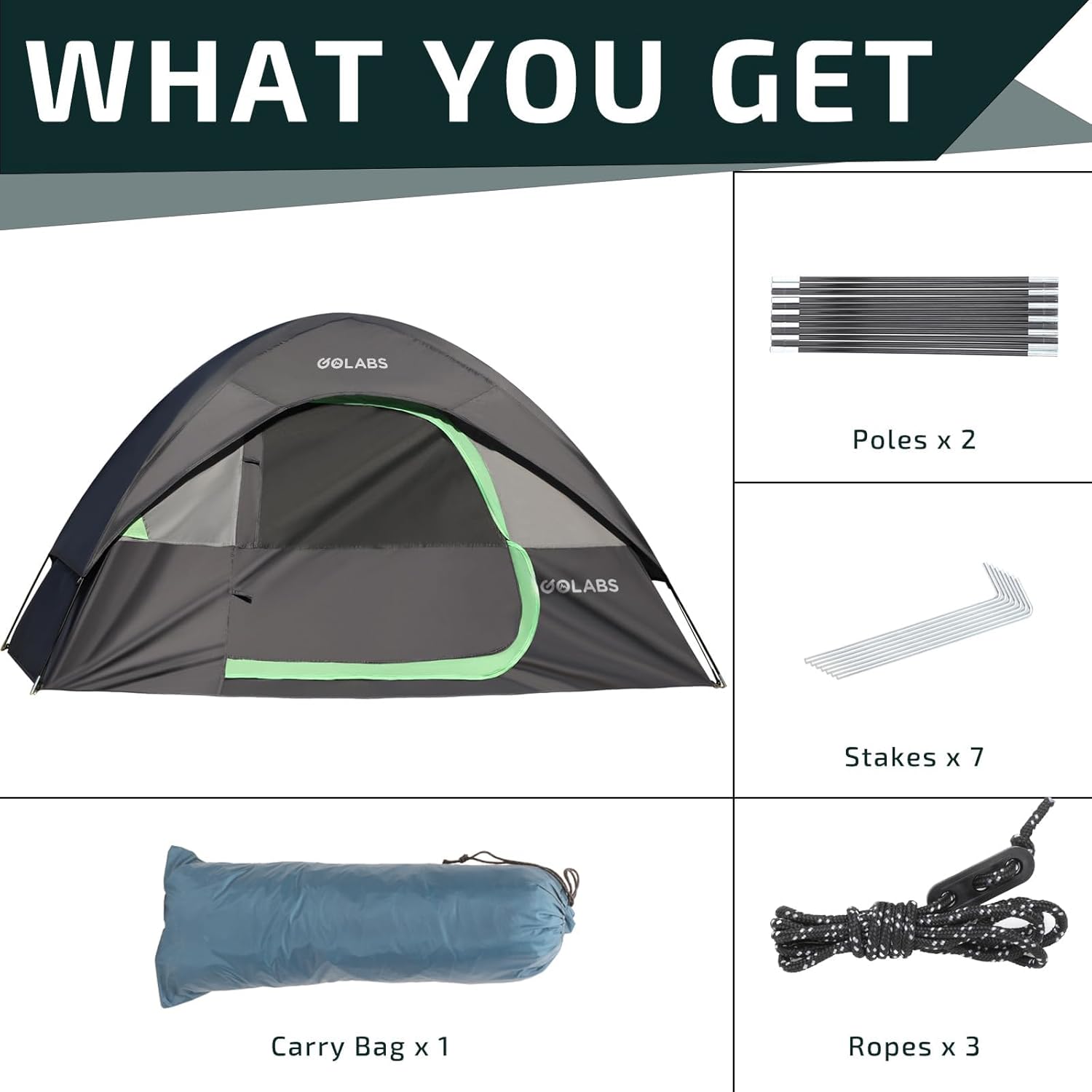 Golabs CT1 2 Person Camping Tent, Easy Set Up in 3 Mins, PU1500mm Waterproof w/Mesh Top & Door with Ventilation, Lightweight 4.4lbs Portable Family Tent with Carry Bag &Interior Storage Pockets &Hook