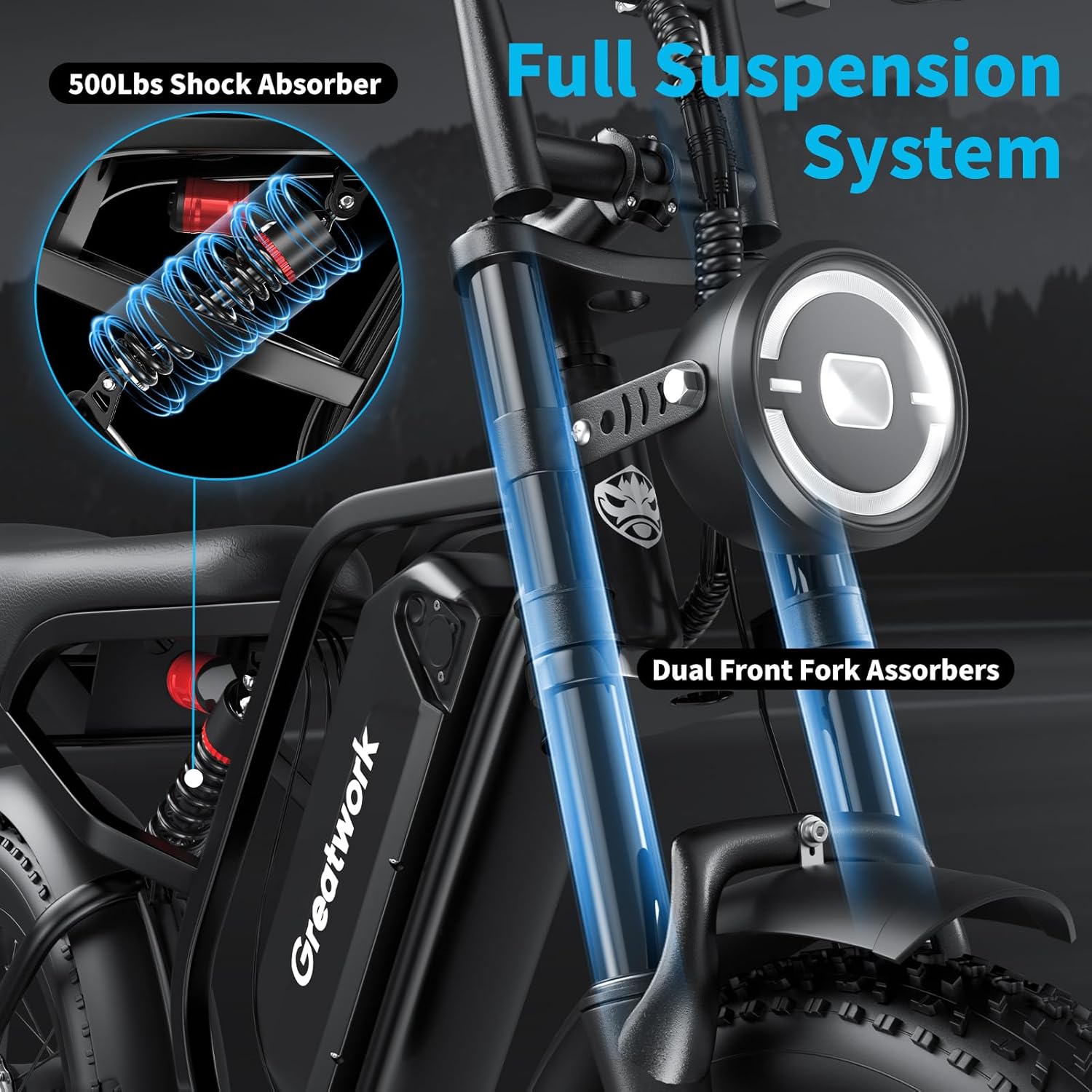 GREATWORK 2500W Peak Electric Bike for Adults, 1200Wh Removable Battery, Max 37MPH & 100 Miles Electric Dirt Bike with Full Suspension, 20″x4″ Fat Tire Motorcycle Style Commuter Ebike for Men Women