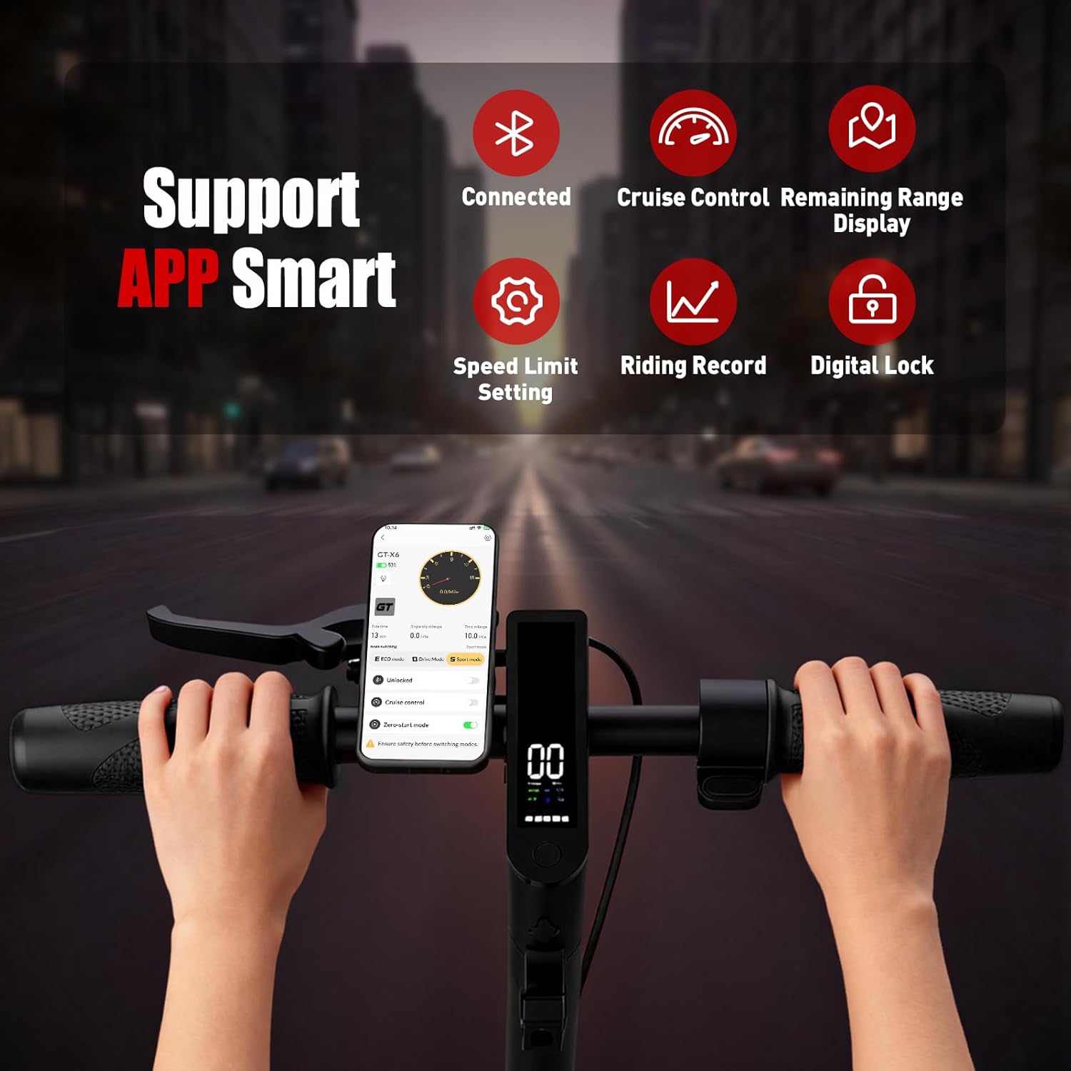 5.【LED Display & Smart App】The LED screen and GTlynck app let you track speed, mode, mileage, and battery level in real time. Connect via smartphone to lock/unlock, set 3-speed modes, or enable cruise control.