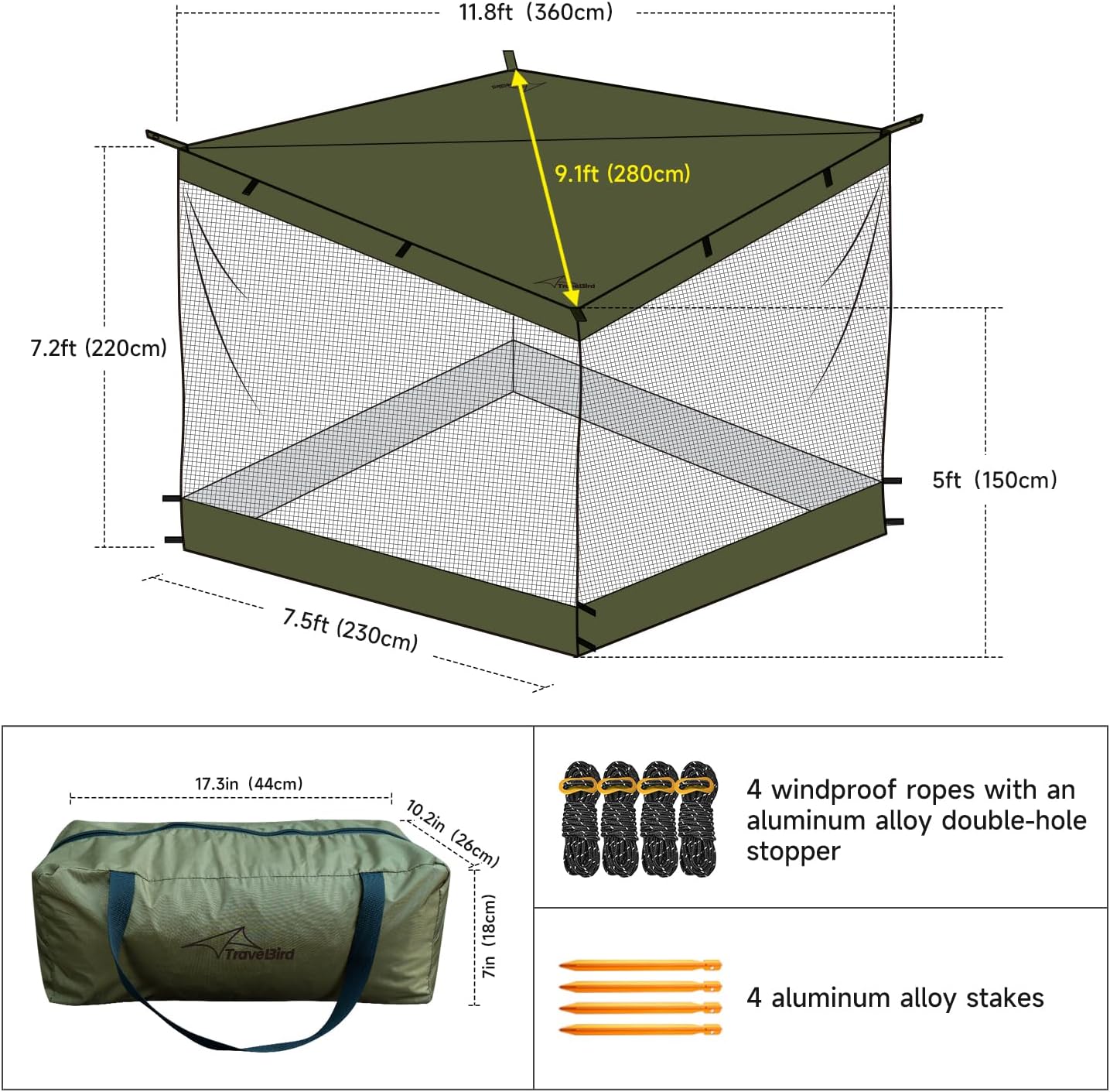 【Lightweight & Accessorized】Weighing just 3.5 pounds and compacting into a storage bag with a handle (17.3X10.2X7 inches), our screen tent is designed for effortless transport and setup. The package includes: 4 tent stakes, 4 windproof ropes with aluminum alloy double-hole stopper.