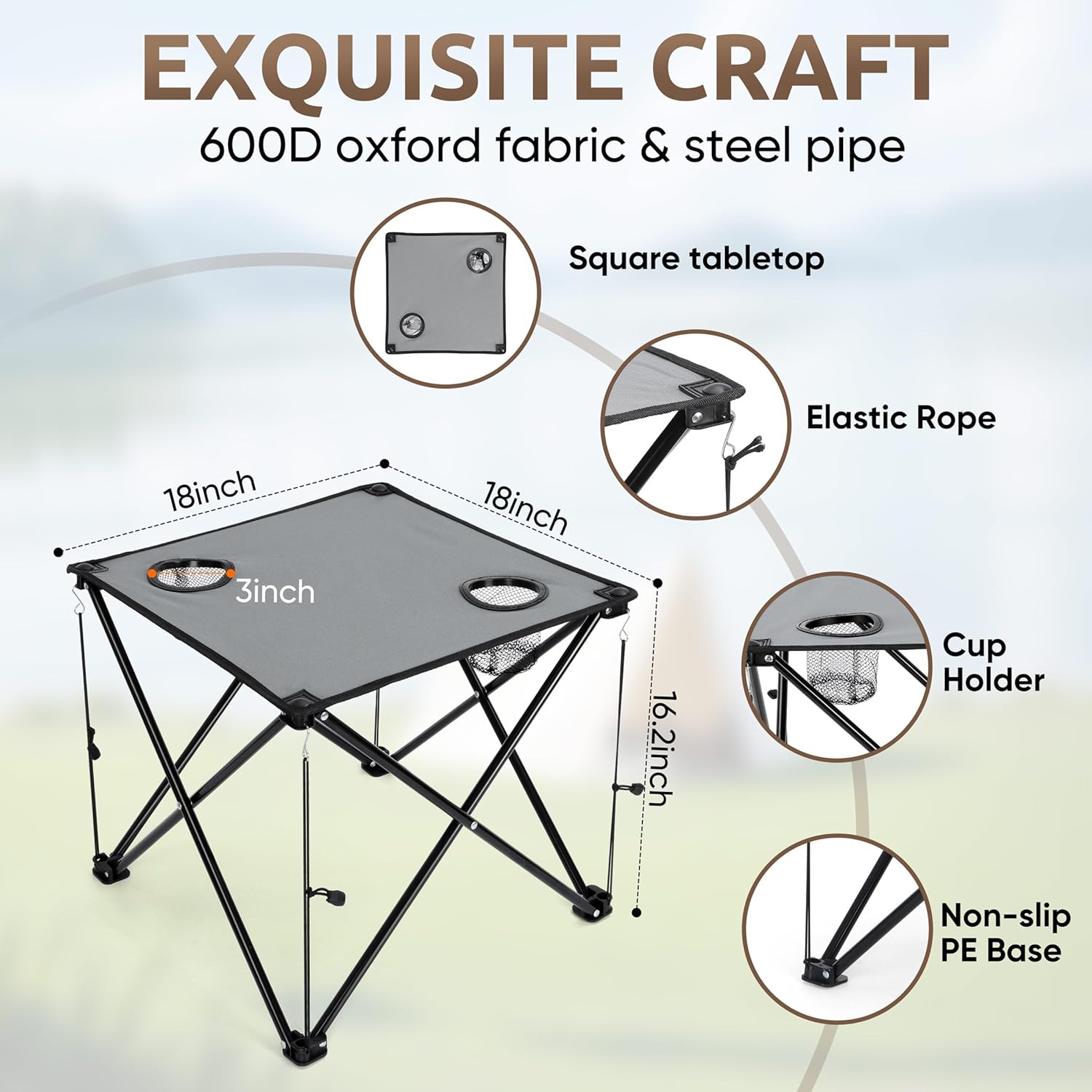 Folding Table: Made of gray 600D oxford fabric and quality steel frame, 4 elastic strings with S-shaped hooks tension the corners and feet of the table to ensure stability when it is opened, support proper weight item without retraction, 18.1” x 18.1” x 16.2”(L x W x H) table offers enough area for putting magazine, snack, picnic food, beverages